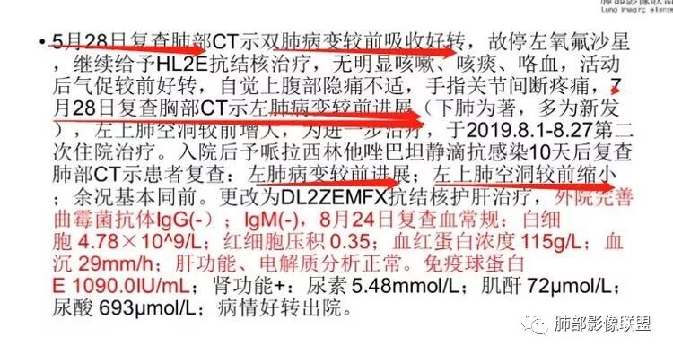 思维过程:2019-10-8小空洞,2019-7-28是不是也有?二元论解释,结核,有效;但又新发有新病灶,空洞前期变大;上腹部隐痛,手指关节间断痛,IgE是不是明显增高,有意义?
