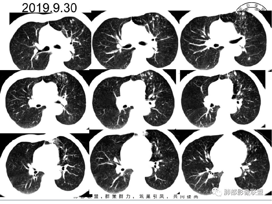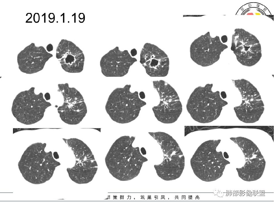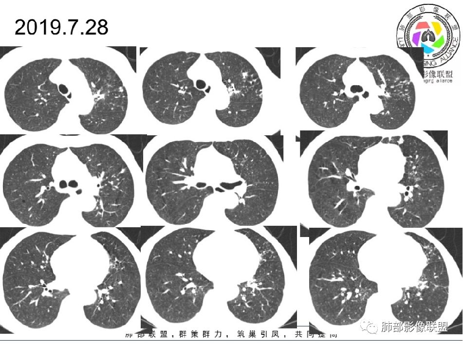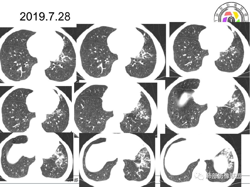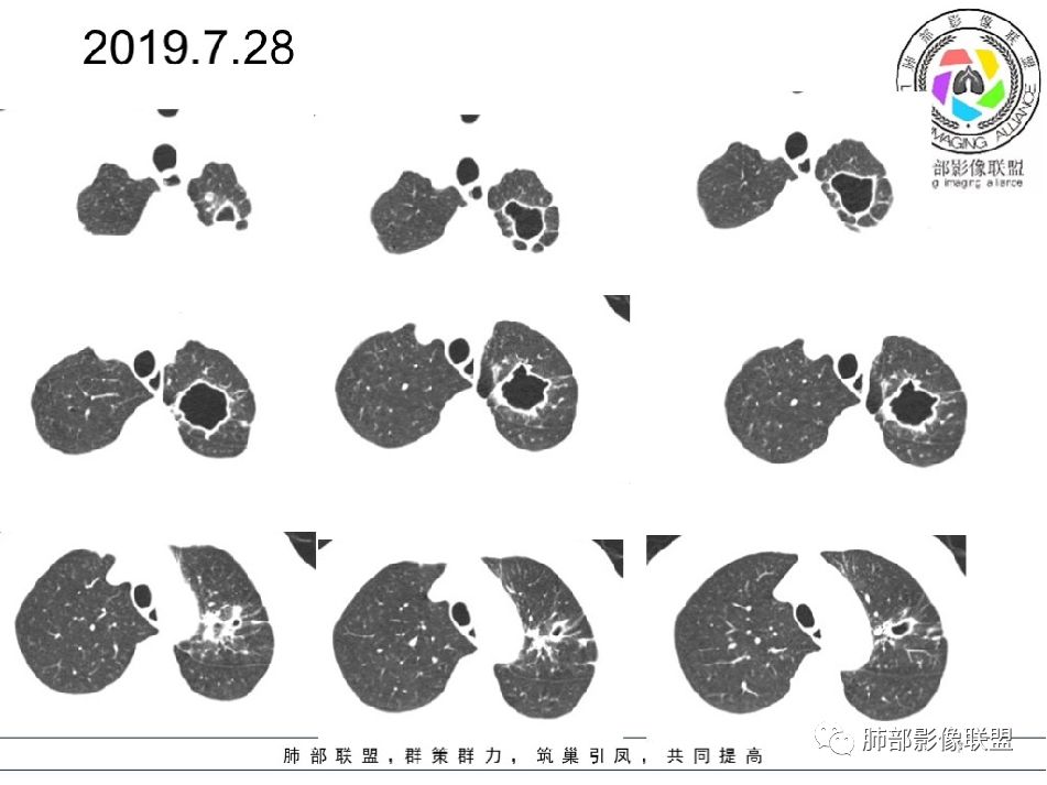 2019-7-28CT左肺病变较前进展(下肺为著,多为新发),左上肺空洞较前增大;
