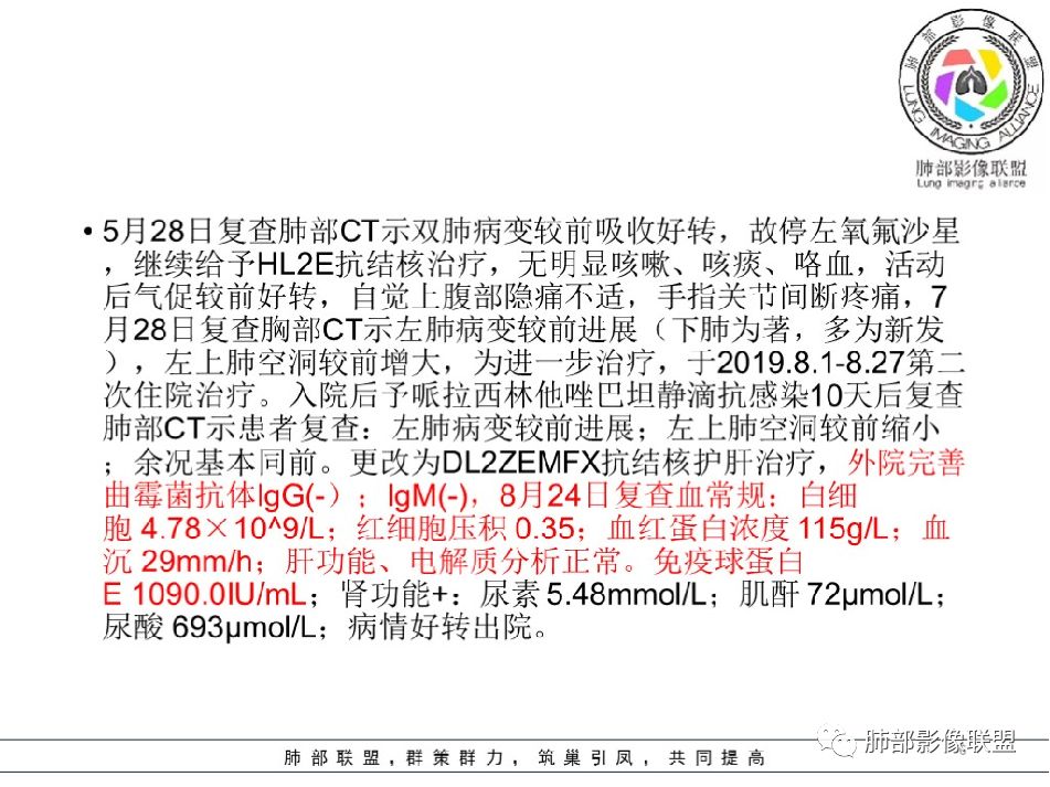 第二次住院(8.1-8.27):哌拉西林他唑巴坦抗感染10天复查,左肺病变进展,左上肺空洞缩小;改为DL2EMFX抗结核护肝;IgM(-),免疫球蛋白E1090.0IU/ml,病情好转出院。
