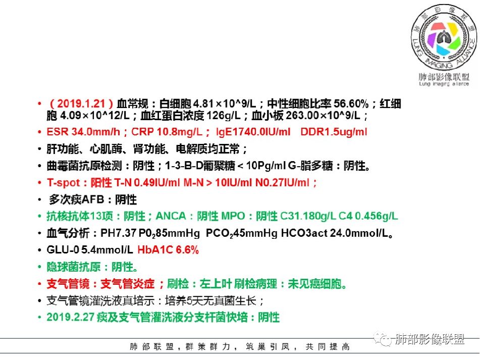 2019-1-19:空洞,纤维条索,树芽,实变;曲霉菌抗原阴性,1-3-B-D葡聚糖阴性;隐球菌抗原阴性;T-spot阳性;多次痰AFB,阴性;刷检,未见癌c。支气管镜(-),痰灌洗液培养(-);