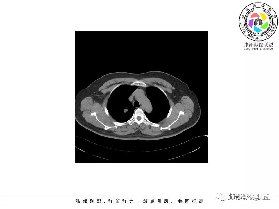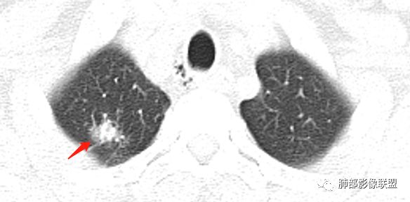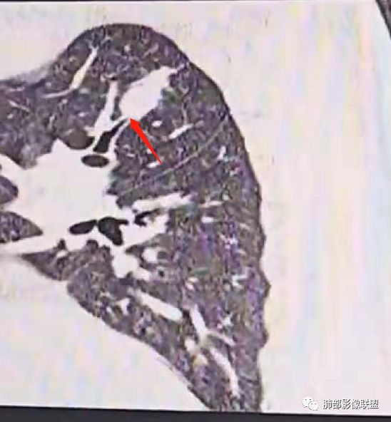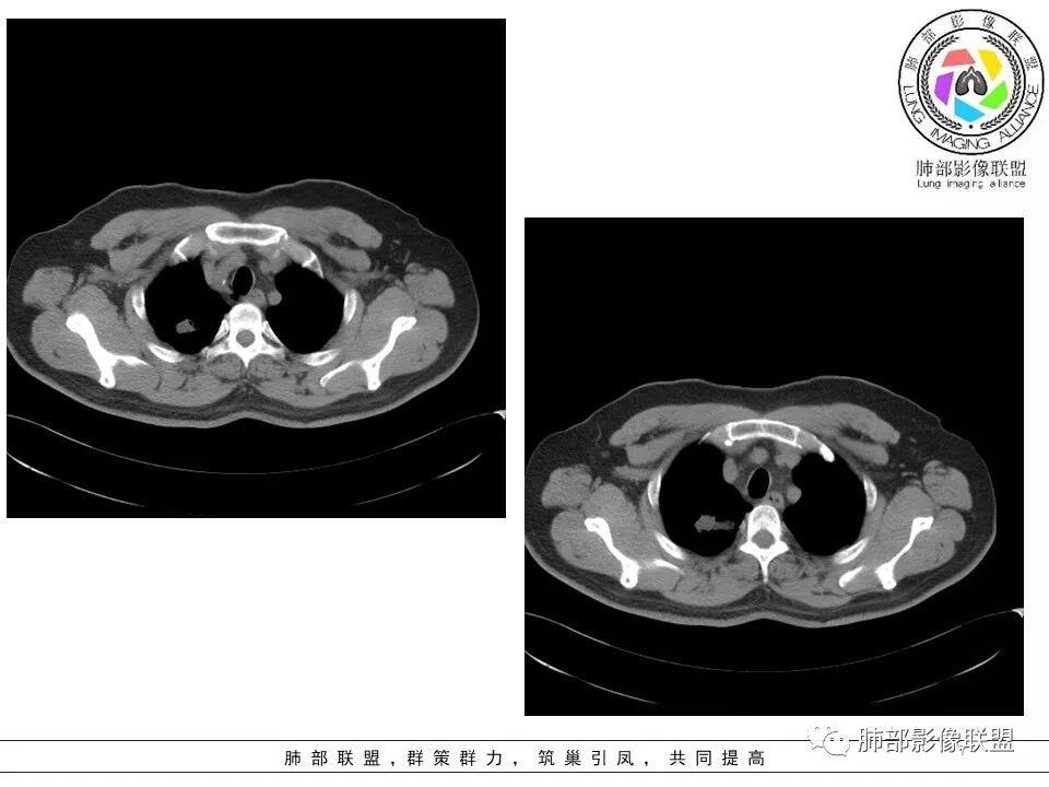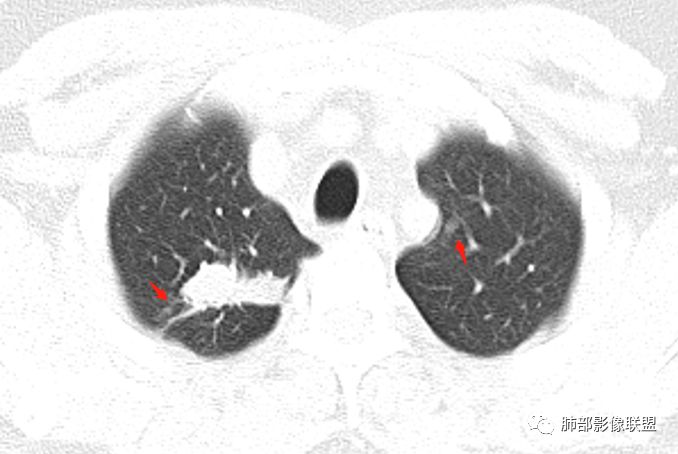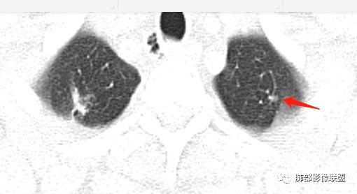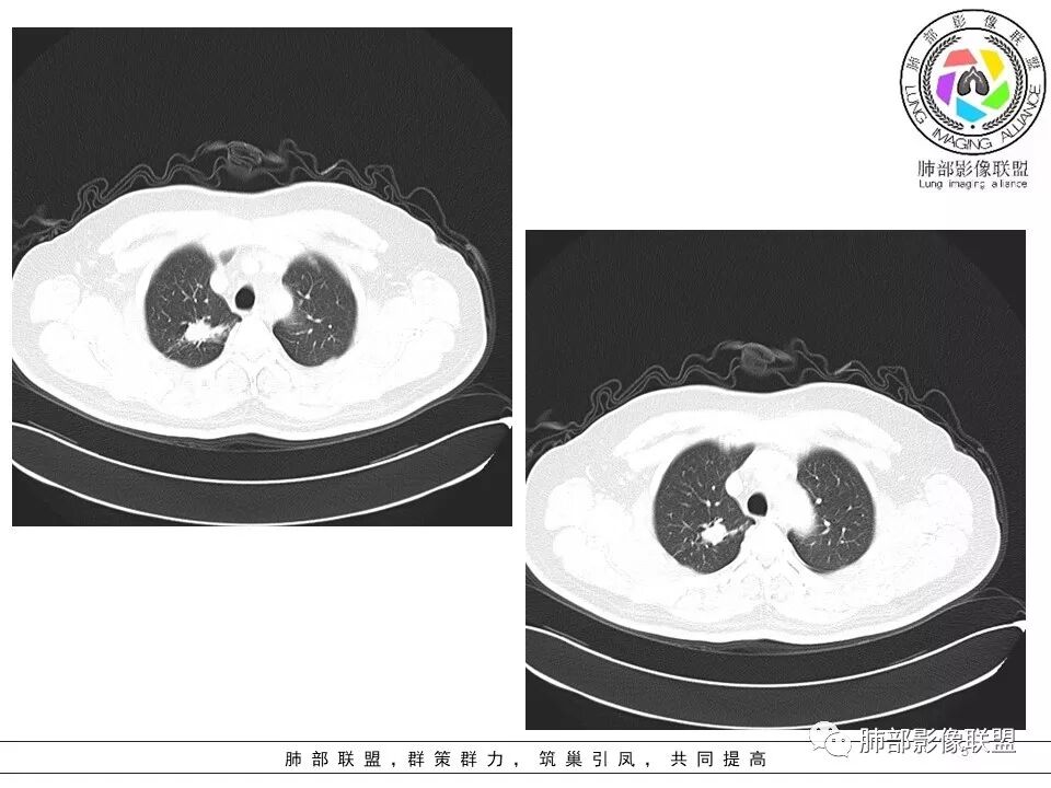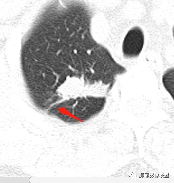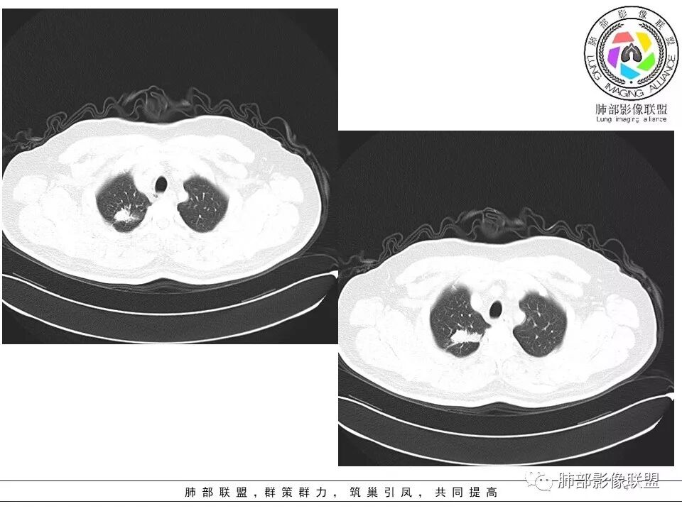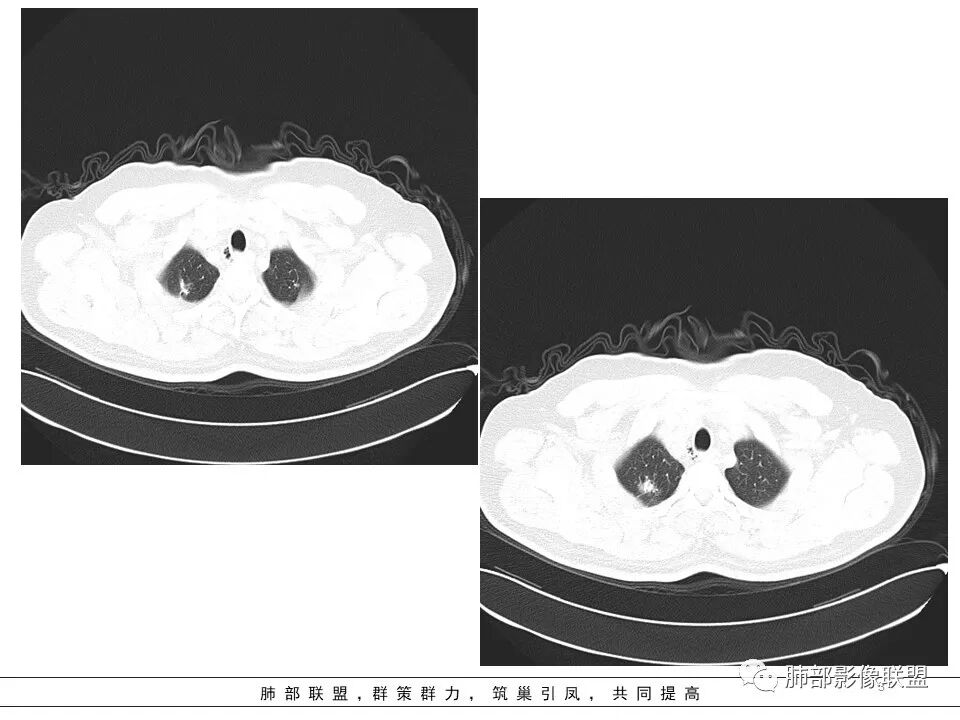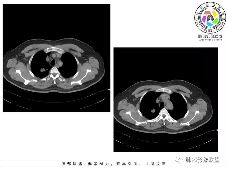 小飞: 晨读:右肺上叶不规则结节灶,沿支气管走形分布,边缘平直,U型凹陷,脊柱侧有少许磨玻璃影,左肺尖少许斑点灶,综合考虑结核。
