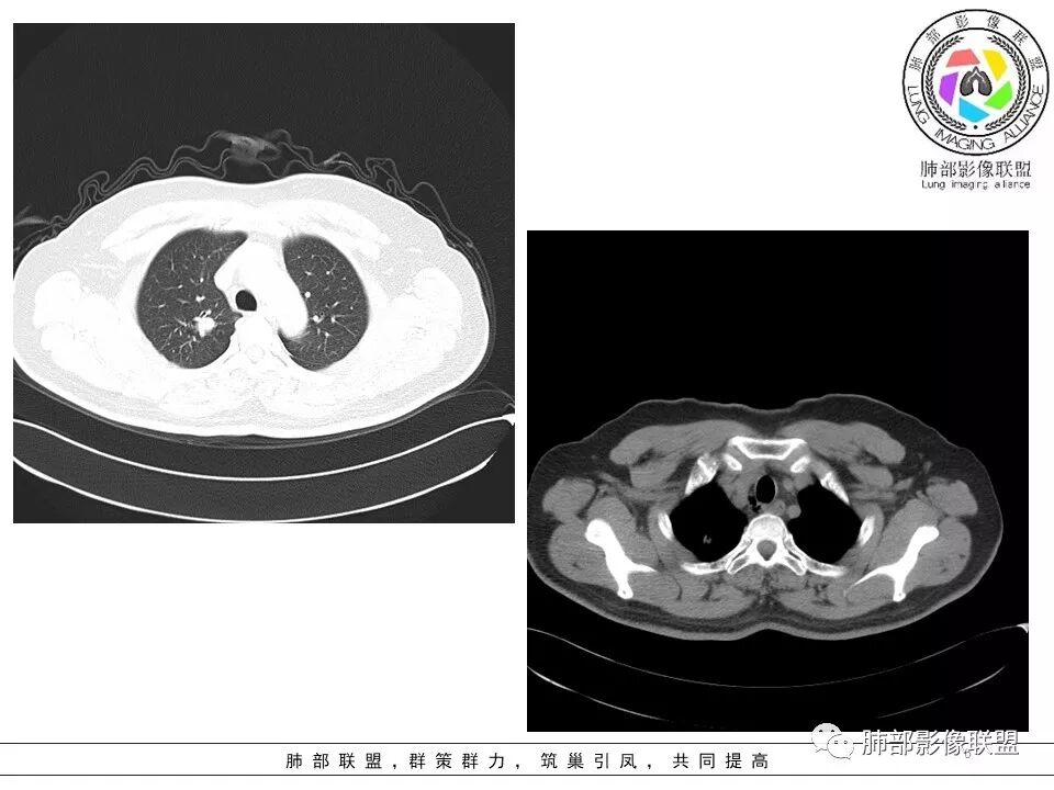灵魂清零: 右上肺结节影既有良性征象也有恶性征象,良性:边界平直,形态扁平,左肺尖有病灶;恶性:周围边界清楚的磨玻璃影,内部密度不均匀,局部边界有膨隆!考虑腺癌,肉芽肿病变待排!进一步增强扫描!再穿刺活检检查!