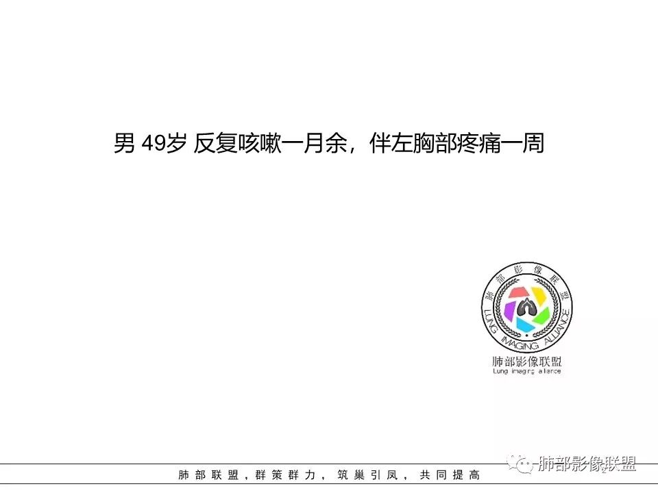 病史:男性,49岁,反复咳嗽月余,伴左胸痛; 影像:形态奇特,长毛刺,疑多灶,支气管阻塞不明显,毛刺不明显,纵膈窗密度不均,其内似见低密度,有凹陷,膨隆不除外,纵膈窗胸膜有点增厚。诊断:结核(右上肺)鉴别:不符合,无钙化,无胸腔积液;腺癌(无淋巴结)。处置:寻找结核相关检查,肿标,纤支镜,增强。