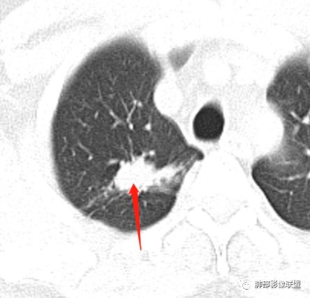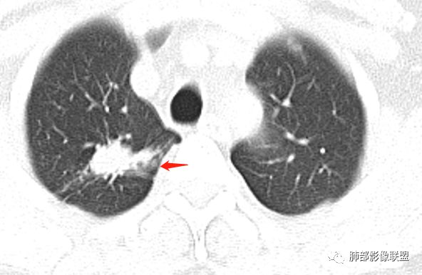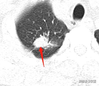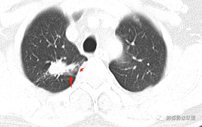 一米阳光: 晨读,右上肺结节影,形态不规则,边缘平直,部分凹陷,长软毛刺,胸膜牵拉,周围卫星灶。考虑结核。鉴别腺癌,部分边缘彭隆