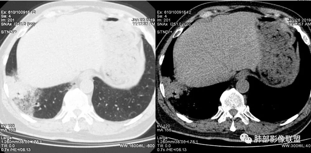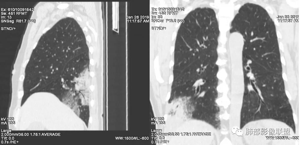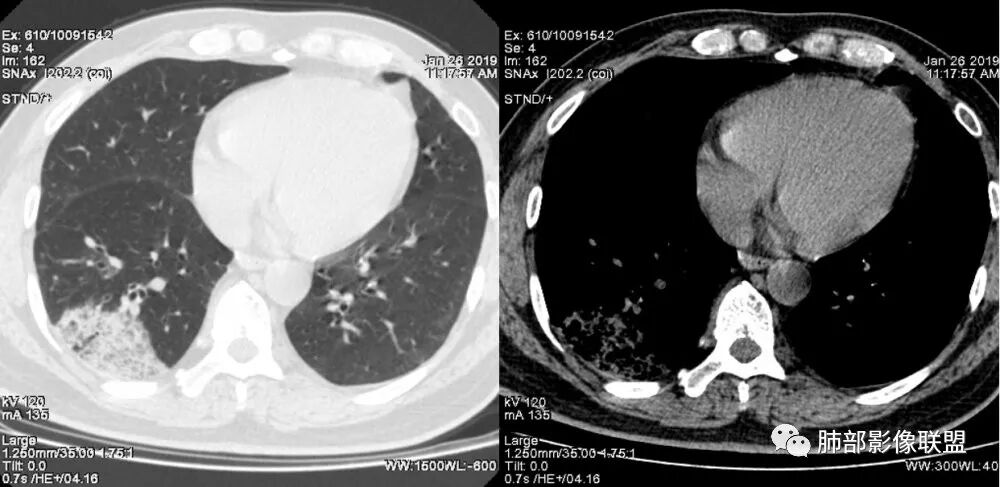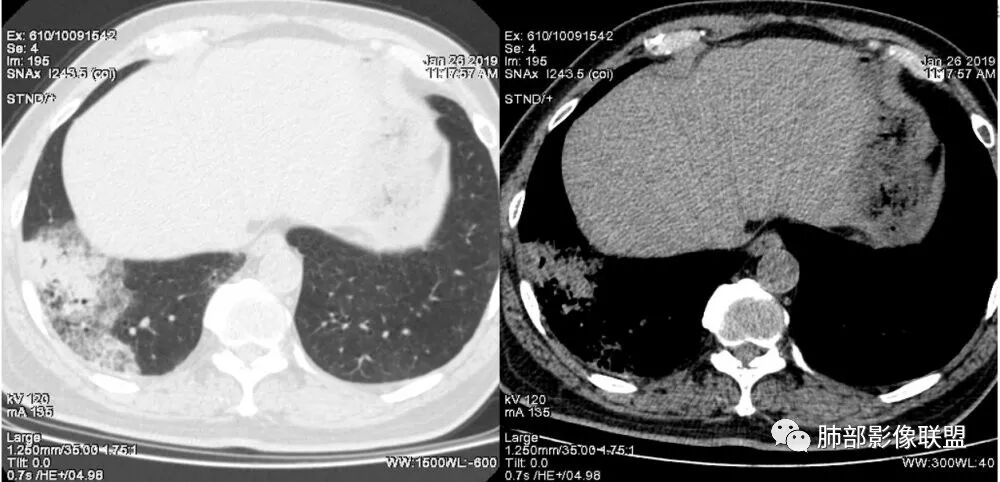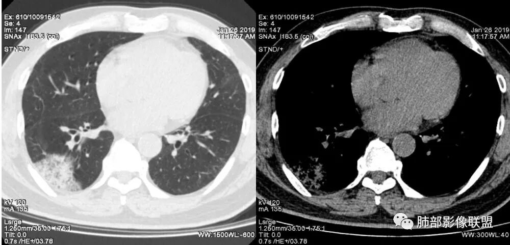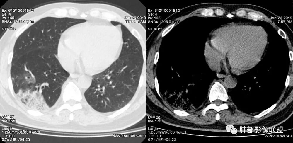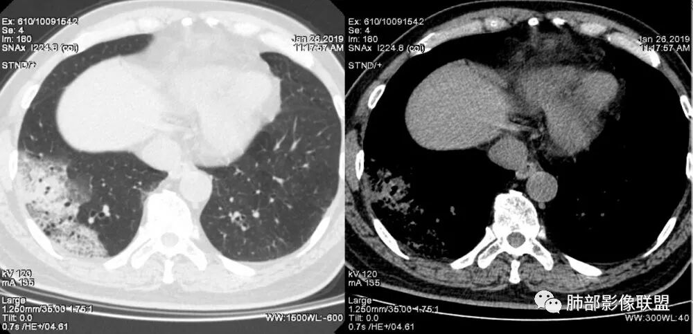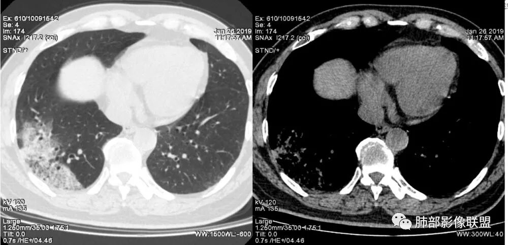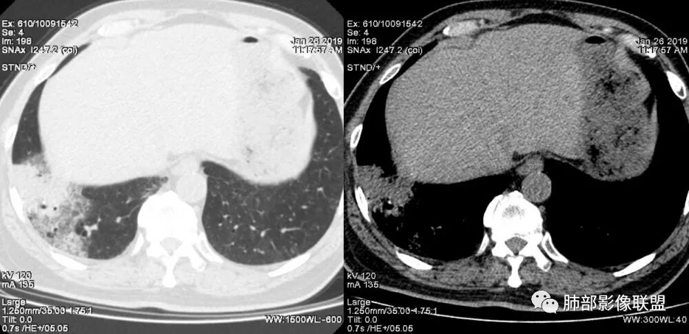 这是潘老师说的外向内吗?右下实变,蜂窝,GGO,支气管变形迂曲,局部膨胀感,肺炎性肺癌,粘液腺癌可能。常规先抗炎再复查。鉴别淋巴瘤,淋巴瘤支气管一般不变形,壁光整,病程长。