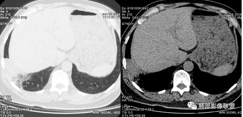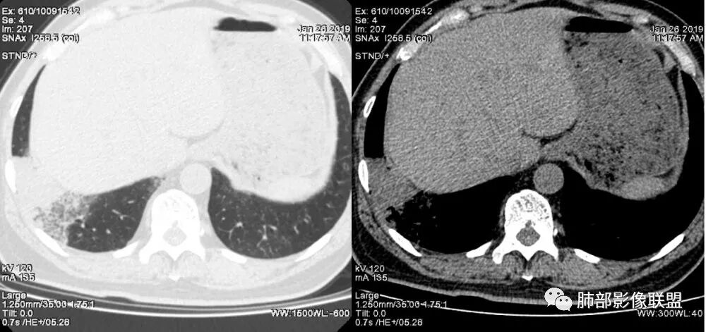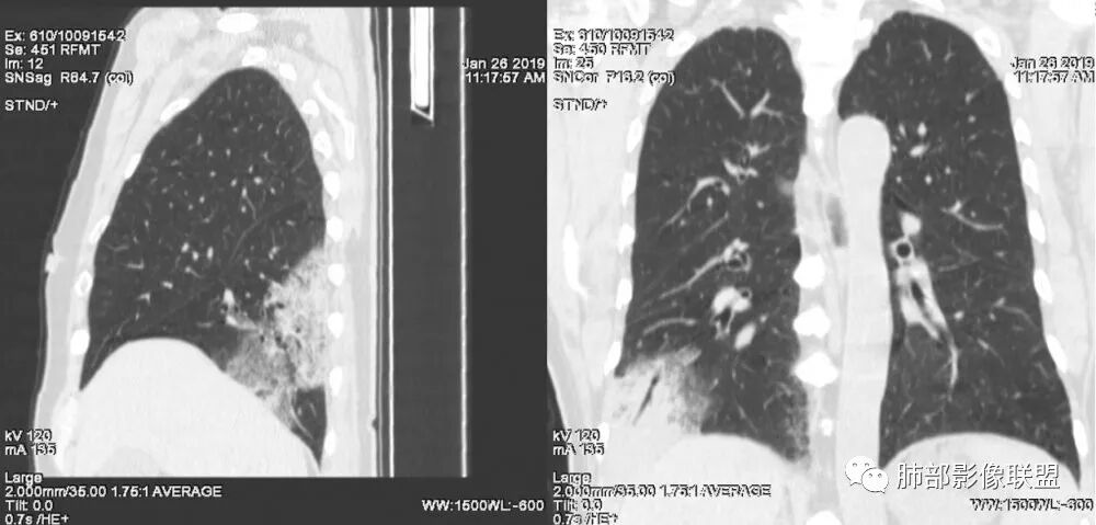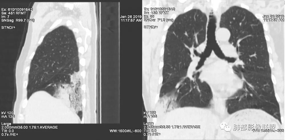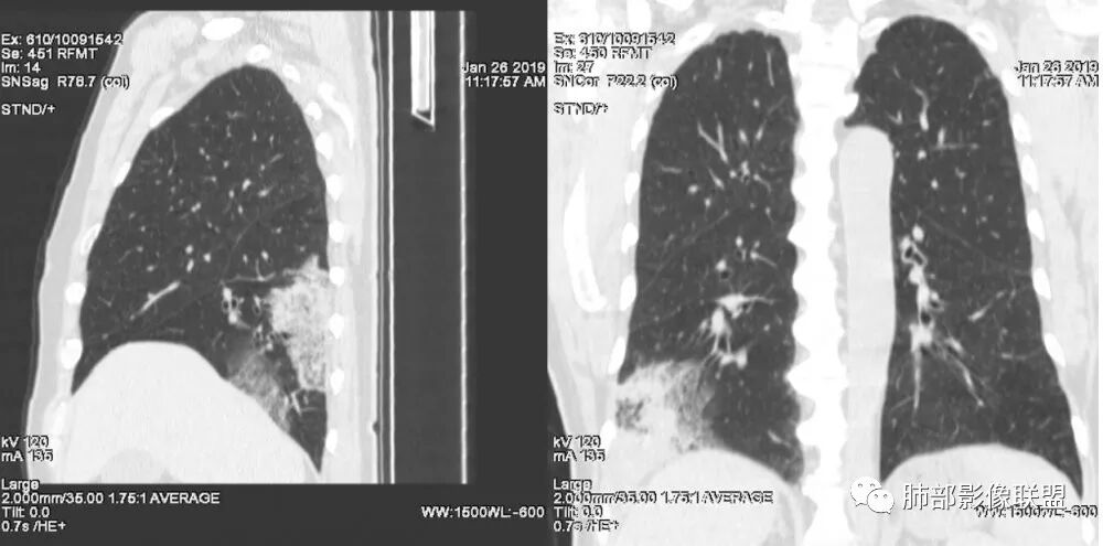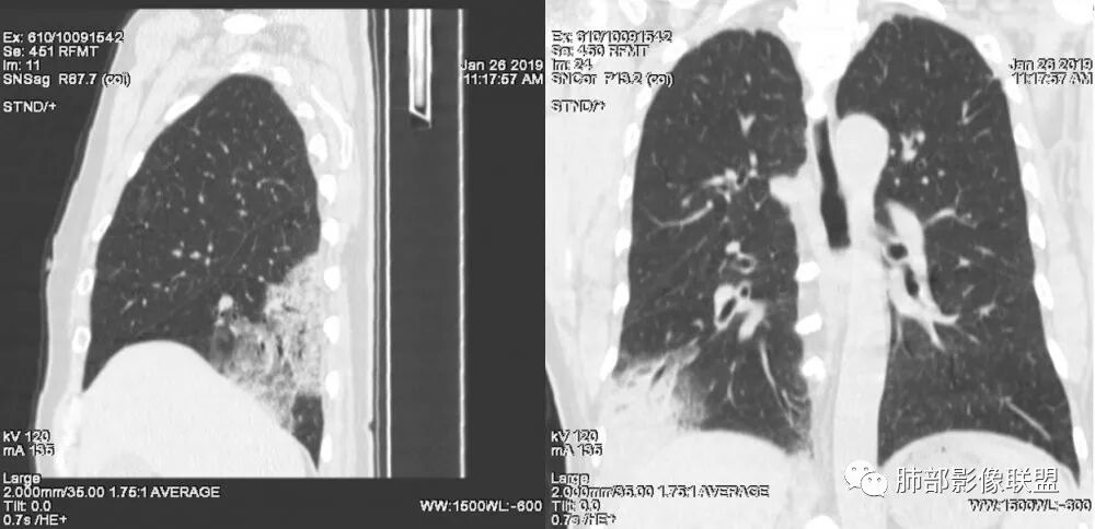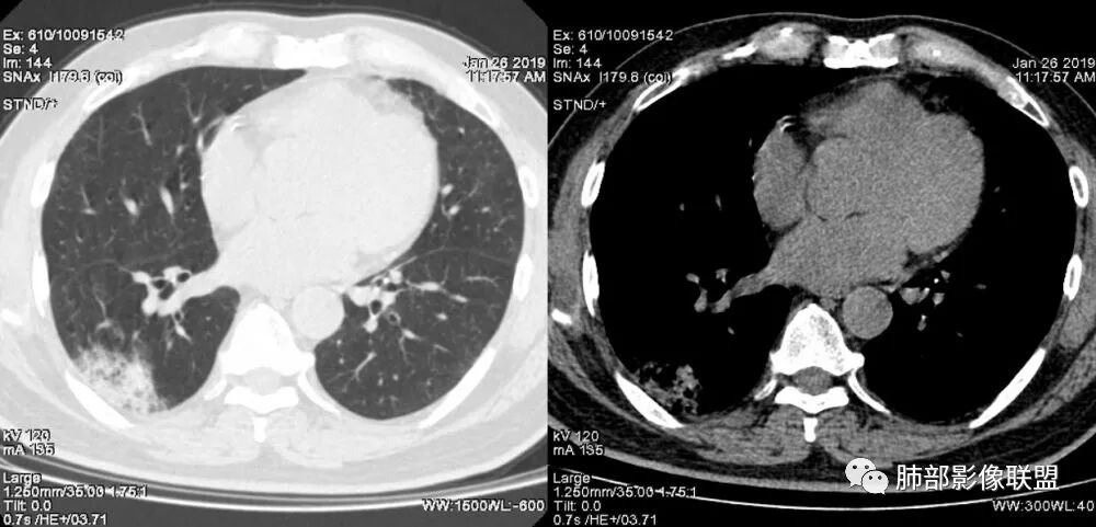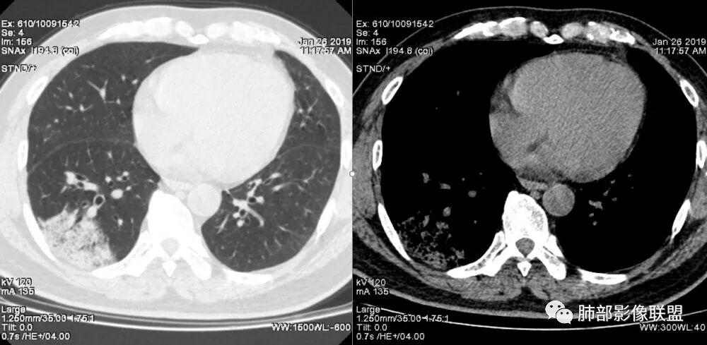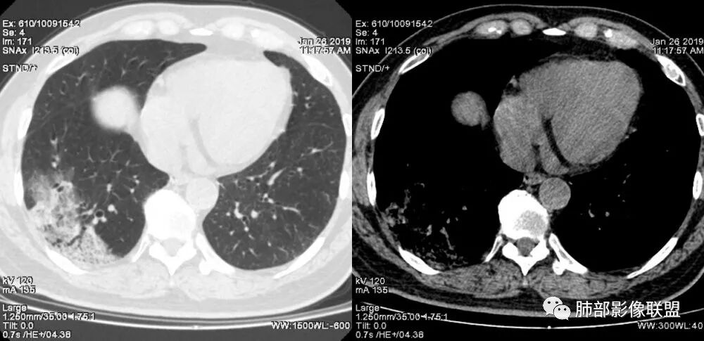 这是潘老师说的外向内吗?右下实变,蜂窝,GGO,支气管变形迂曲,局部膨胀感,肺炎性肺癌,粘液腺癌可能。常规先抗炎再复查。鉴别淋巴瘤,淋巴瘤支气管一般不变形,壁光整,病程长。