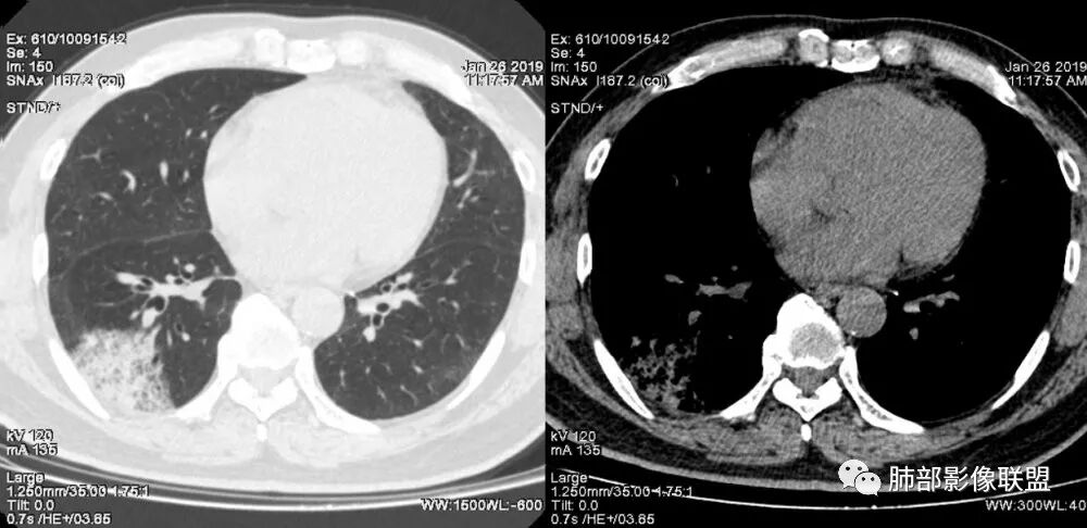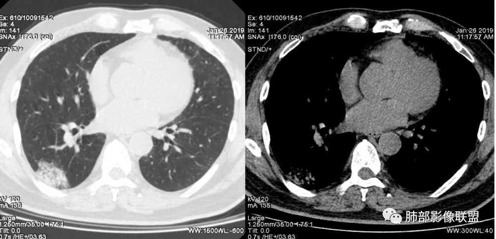 中年女性,右肺下叶沿胸膜下大片状高密度影,实变加GGO,外朝内发展,边界较清,内可见蜂窝征及枯树征,考虑肺炎型肺癌。