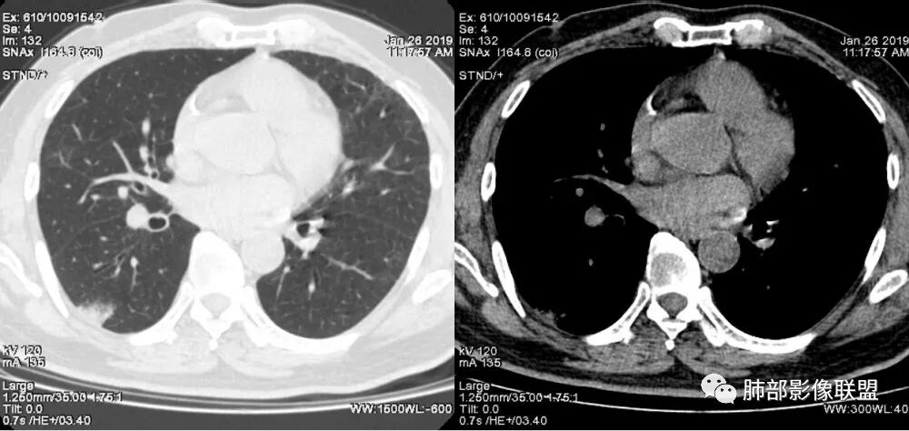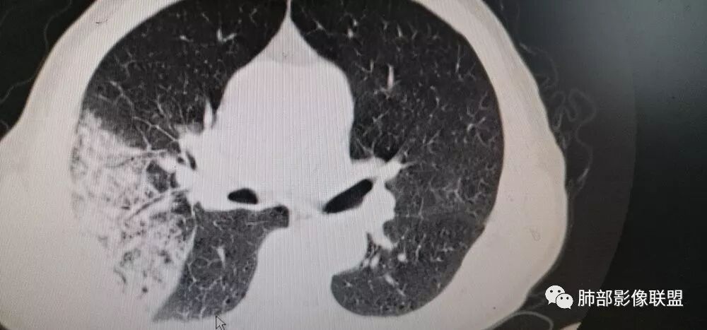 1.本例病灶较大片混杂密度影,胸膜下分布为主(未沿着支气管分布),该分布特点可见于大叶性肺炎、干酪性肺炎、淋巴瘤及粘液腺癌等。可惜未提供增强扫描图像。