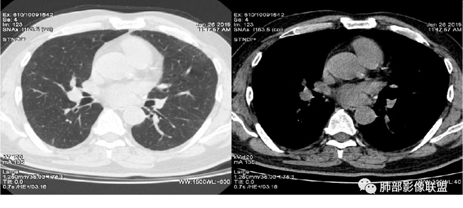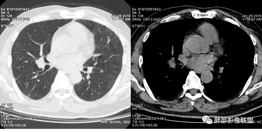 我觉得纵膈窗可以更好观察,纵窗看支气管很紊乱的感觉,鉴别,肺炎的支气管充气征,支气管走形还是很自然的