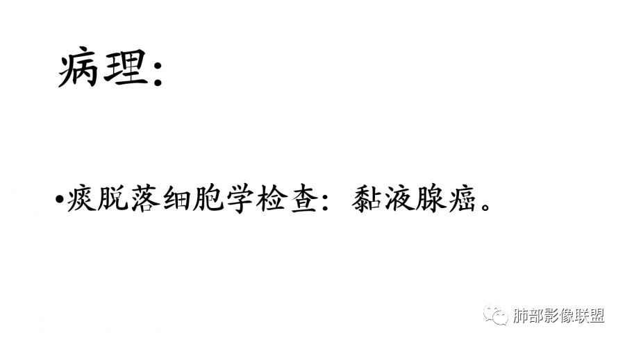 粘液腺癌是一种原发性肺腺癌的变异型,病理上起源细支气管壁以远的支气管与肺泡上皮,属于周围型;其细胞形态及排列方式与非粘液性腺癌有所不同,为成簇排列的粘液腺上皮,很早就有细胞内粘液及分泌细胞外粘液;早期粘液腺癌常为一单发结节,有沿气道距离播散的能力,中后期肿瘤细胞随粘液飘向更远的肺段及肺叶,会出现斑片状肌片状实变和/或磨玻璃密度样的肺炎样影像学改变;随着肺粘液腺癌体量的增大,粘液的播散,临床上会有咳白痰,查痰液脱落细胞会找到肿瘤细胞。