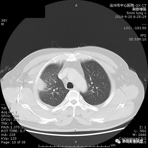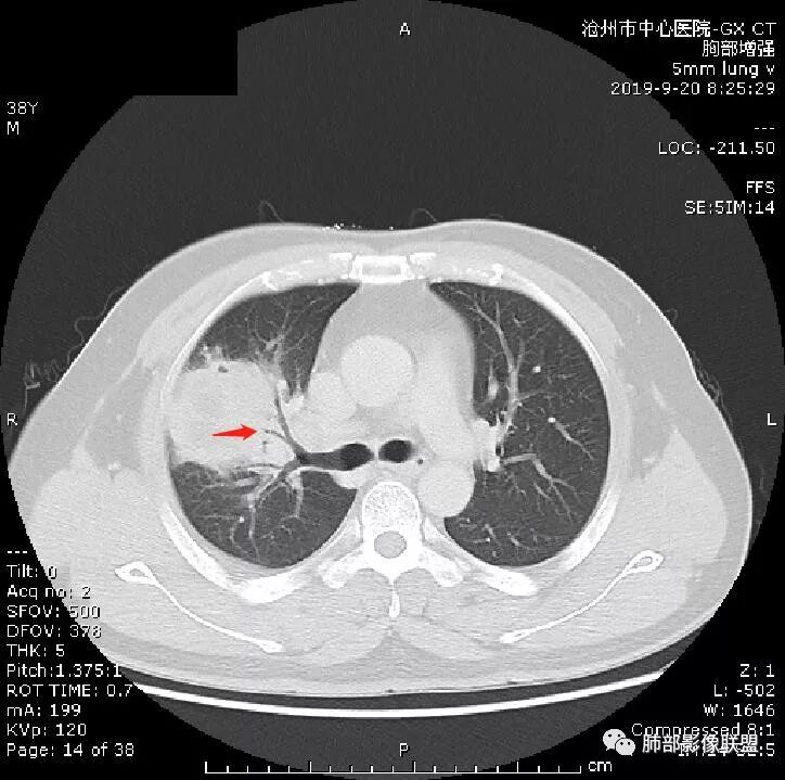 38岁,男性,慢性咳嗽2月,右胸痛8天,无发热。白细胞高,肿瘤标志物不高。右上肺不规则块状影,周围有磨玻璃影,边界模糊,整体有膨胀感,分叶,与胸膜糊墙,可疑栽赃,增强肿块中央坏死,边界清,周边强化明显,强化区有低密度影,壁不规则,跨叶生长,支气管截断,伴支气管扩张,综合考虑腺癌