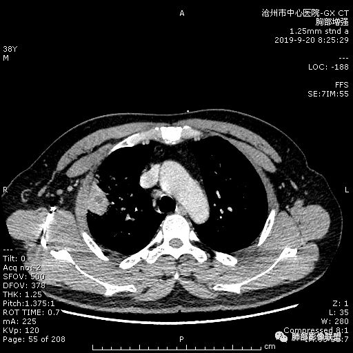 38岁,男性,慢性咳嗽2月,右胸痛8天,无发热;白细胞高,肿瘤标志物不高;右上肺不规则块状影,周围有磨玻璃影,边界清,整体有膨胀感,分叶,与胸膜糊墙,并见栽赃,增强肿块中央坏死,周边强化。综合考虑,考虑恶性,鳞癌可能。
