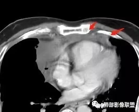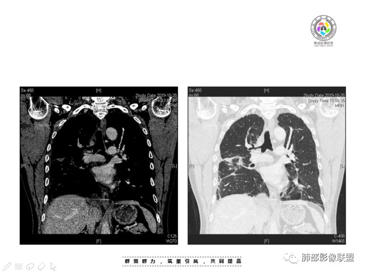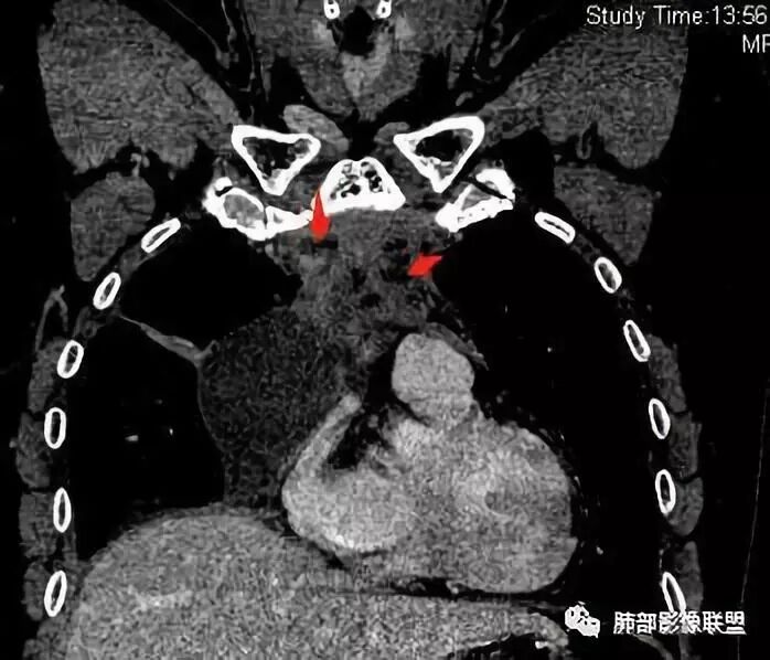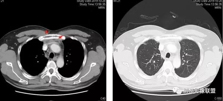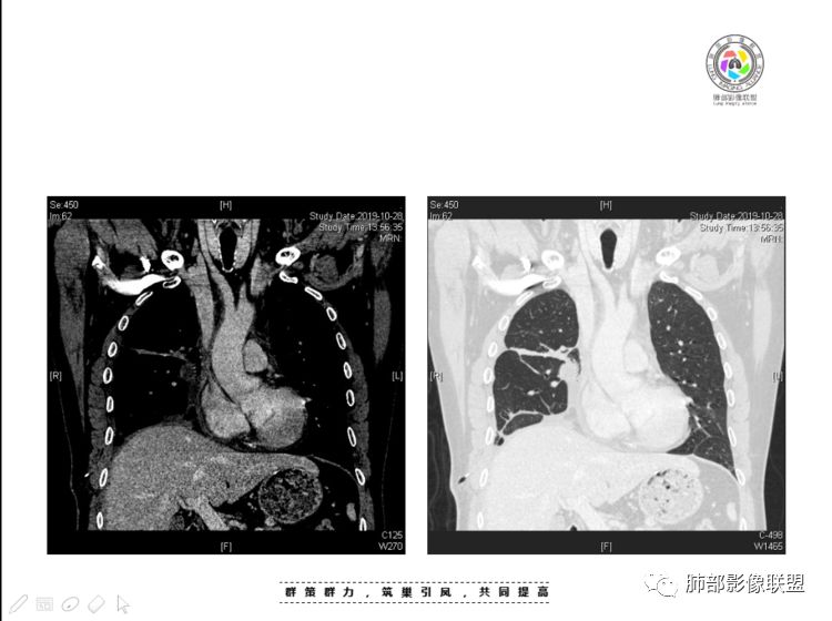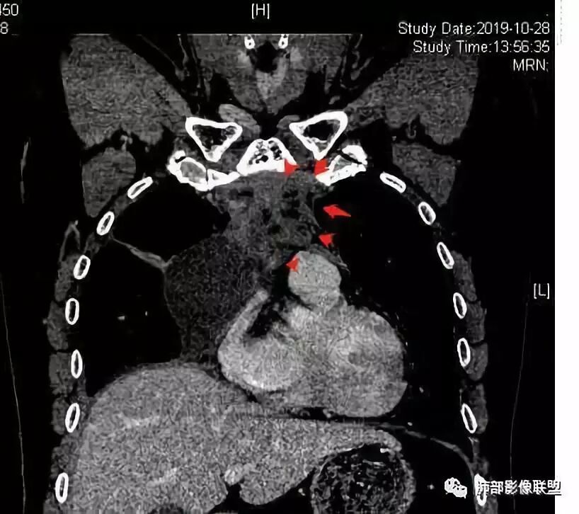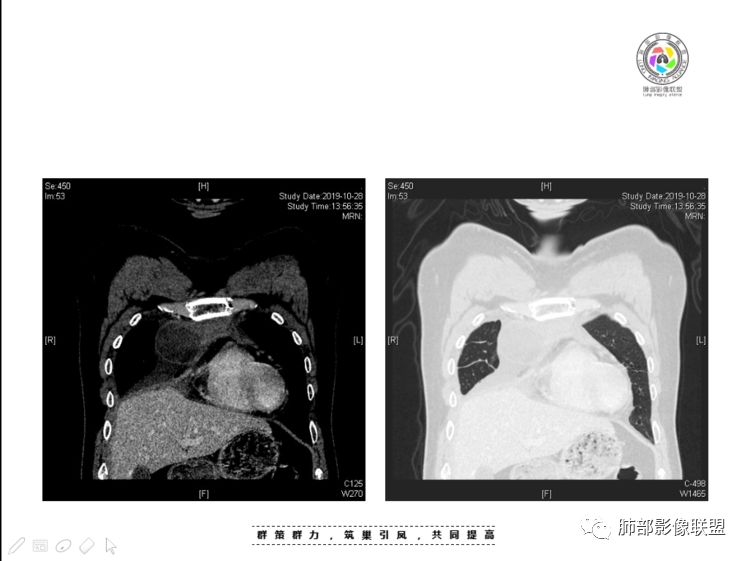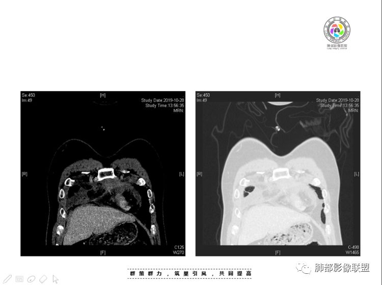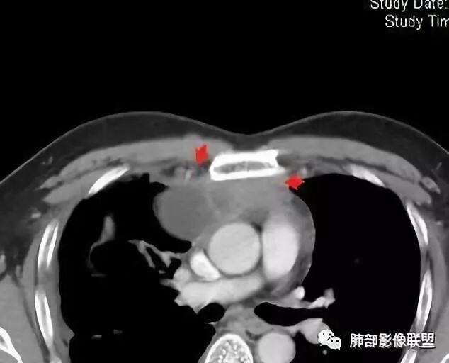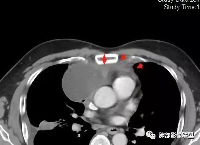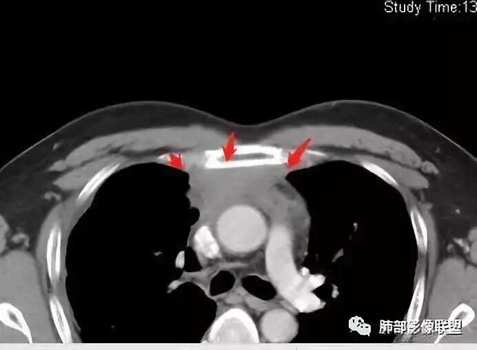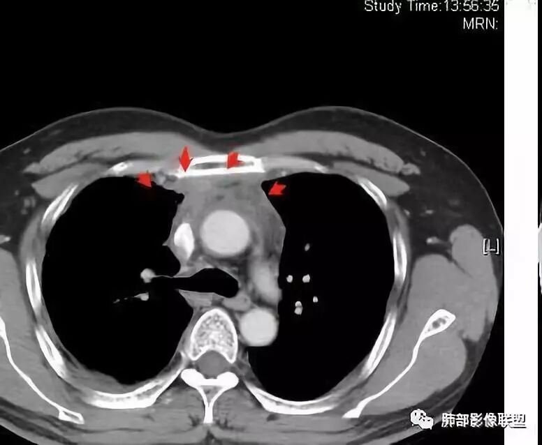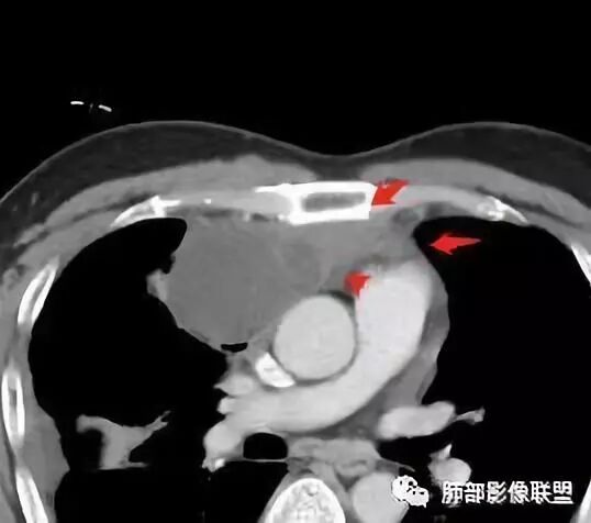 南边:我总觉得这个纵隔内不像是一个肿块的改变,扁平,周围蔓延:有符合炎性的的特点,或者肿瘤的侵犯;但是肿瘤的侵犯,不大符合,实性部位的边缘过于柔和,没有毛糙的侵犯边缘。