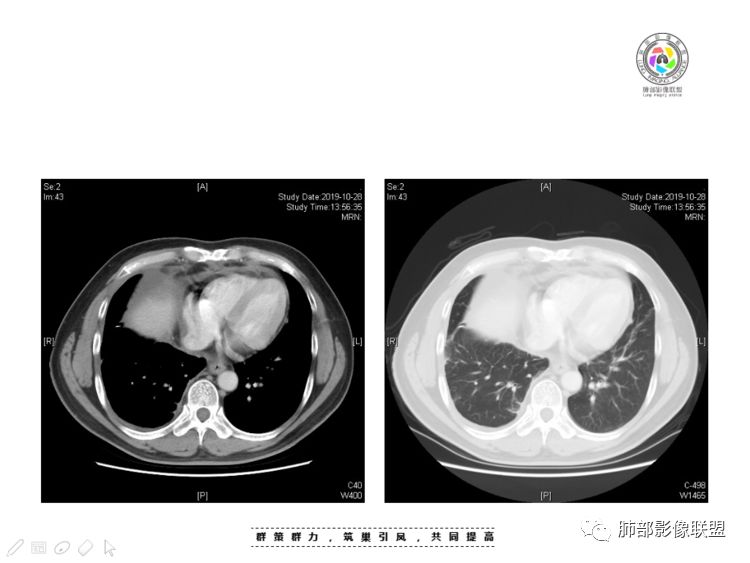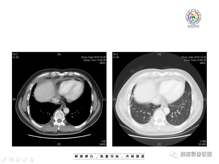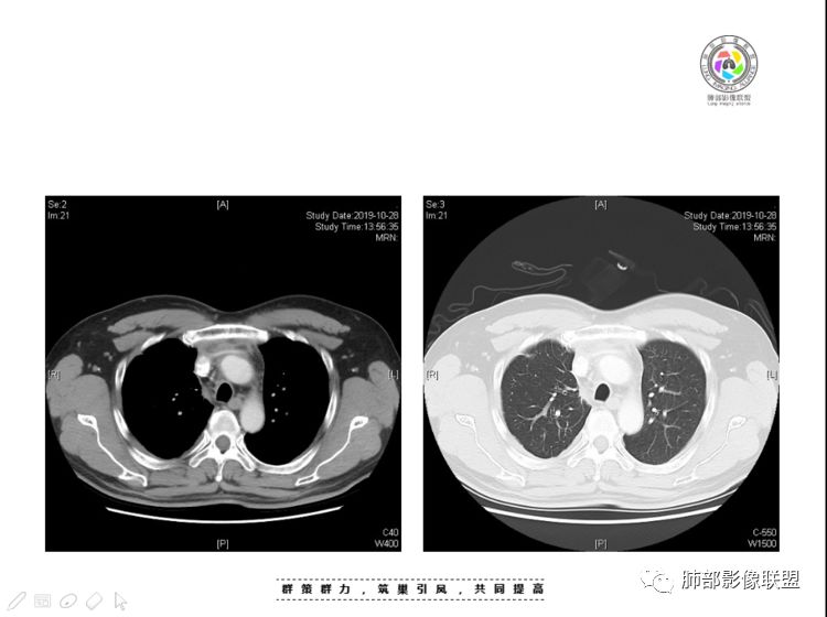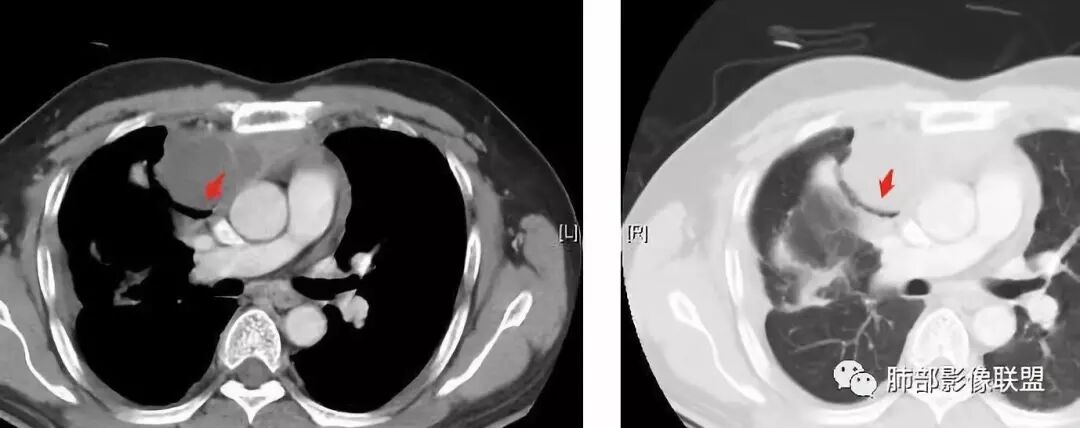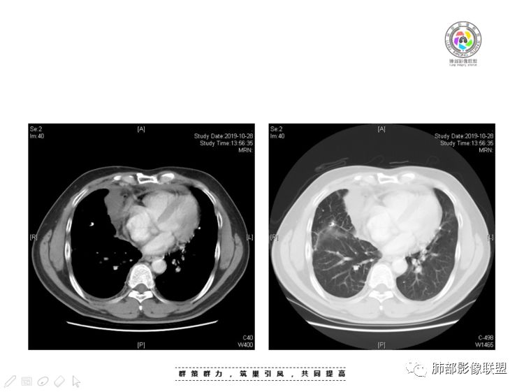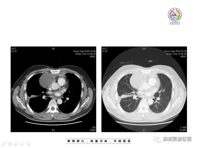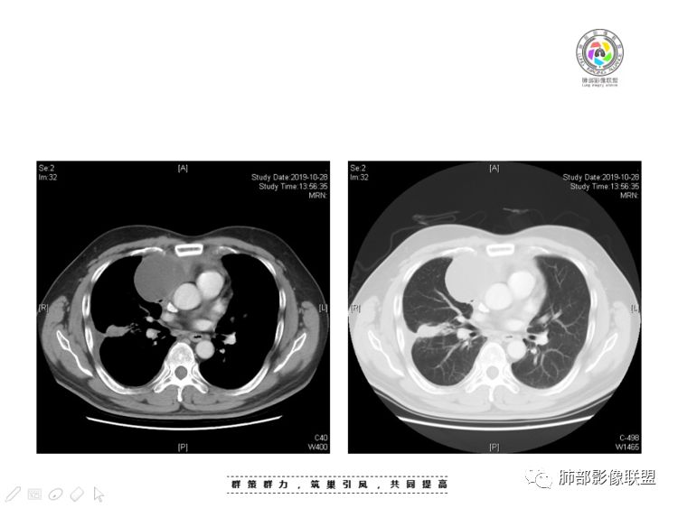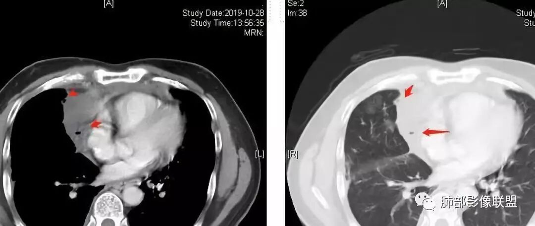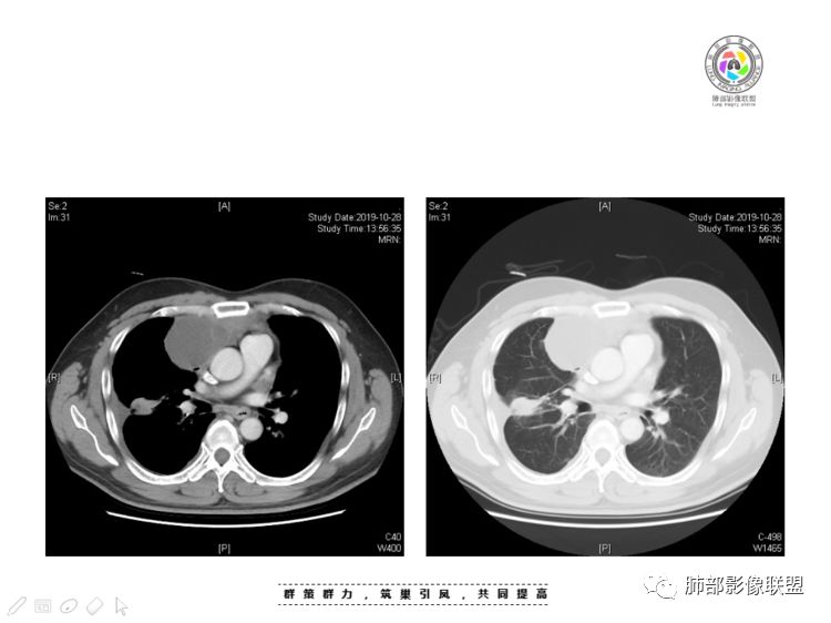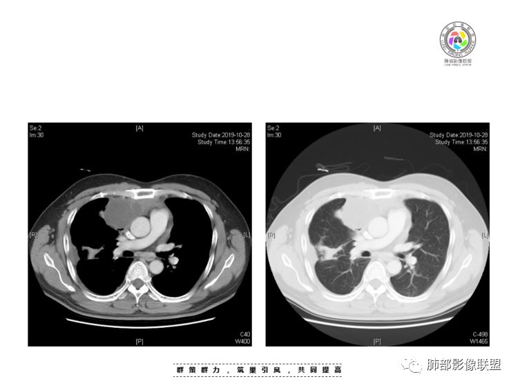 尽管前纵隔病灶缺乏相关病理资料,但是小编还是认为肺内与纵隔病灶以二元论解释。只是肺内恶性病灶引发的胸膜改变可能会影响我们对纵隔病灶的判断。