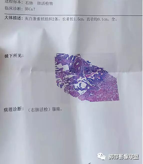 1、右肺内病灶,病灶呈结节样,边缘欠规则,局部膨隆,叶间裂胸膜牵拉凹陷,再看相应支气管腔堵塞截断,临床资料胸水中查到癌细胞,均提示病灶倾向恶性,腺癌的病理意见与之相吻合。