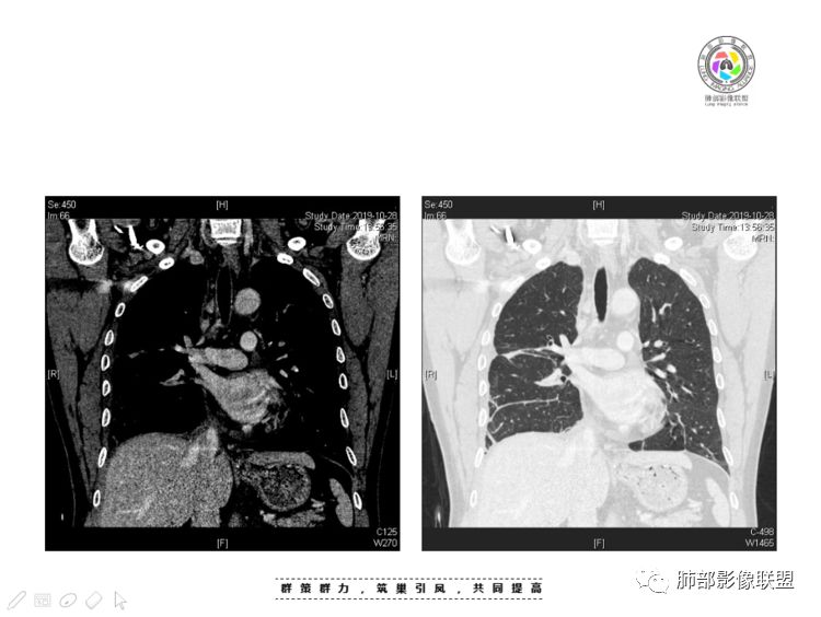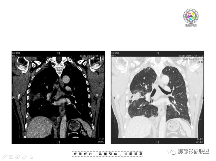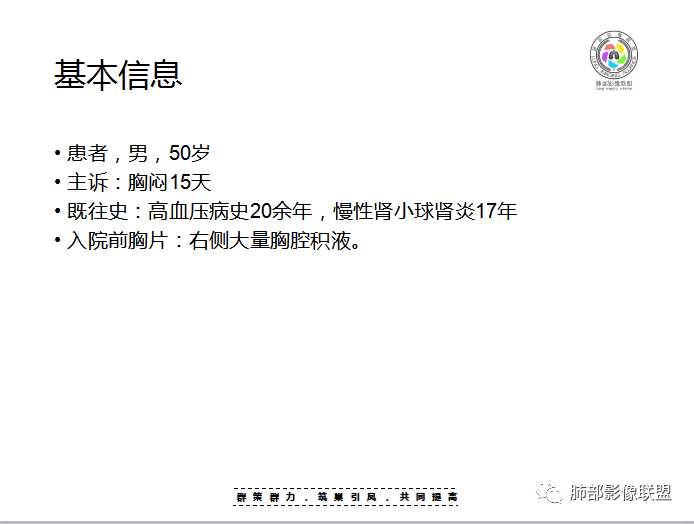 三个石头:这个囊性和实性是一个病灶吧,整体囊实性清嘉:好像不能统一Coke with ice:没想起来用什么病来同时解释纵隔及肺内病变南边:患者,男,50岁主诉:胸闷15天既往史:高血压病史20余年,慢性肾小球肾炎17年入院前胸片:右侧大量胸腔积液。病史提示:慢性肾小球肾炎17年,高血压20年,才50岁提示30岁就有问题高血压可能与肾病有关