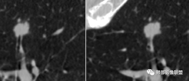 紫气东来:病例一,左肺结节,边缘平直,考虑炎性结节,病例二,结节内空泡,支气管截断,血管进入,考虑恶性