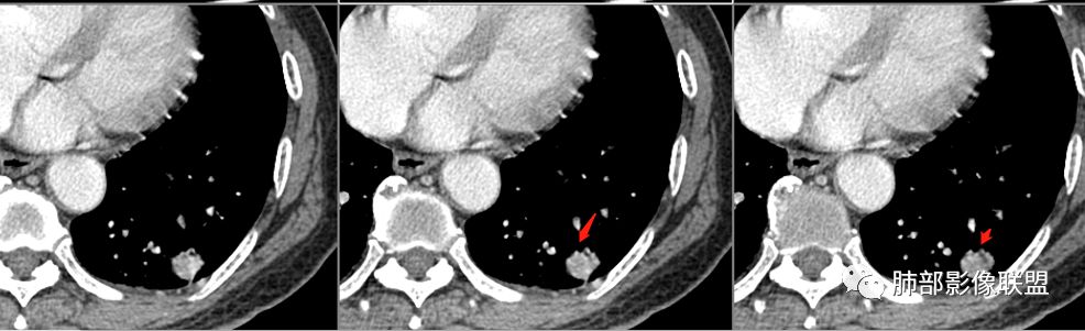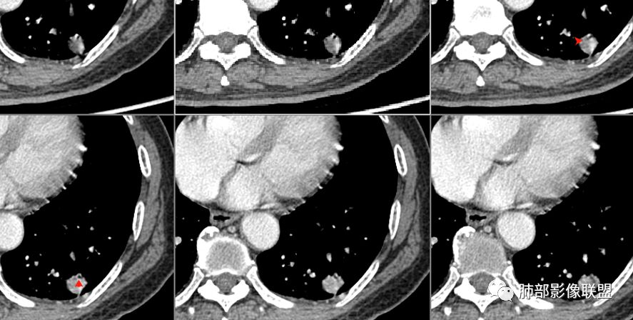 晨读一:左肺下叶胸膜下结节,边缘毛糙,可见长索条,与胸膜接触面不规则,伪影重,磨玻璃不好说,增强后不均匀强化,考虑炎性结节。