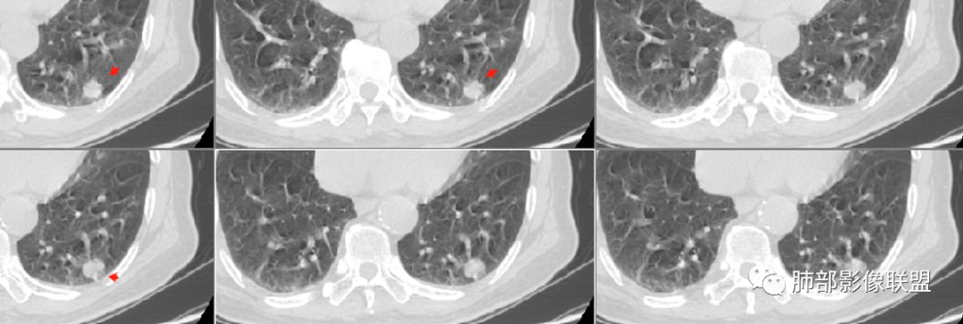 病例2肉瘤样癌的病理意见有些出乎预料,也充分说明病变及影像表现的复杂性。病灶小结节支气管截断、空泡、分叶、短毛刺、血管集束征等似乎均符合肺癌的影像特性。肺鳞癌及肉瘤样癌往往范围较小就可以出现坏死,但如果结节太小则很少能够在影像上观察到坏死区或空洞,没有增强扫描图像更是如此。