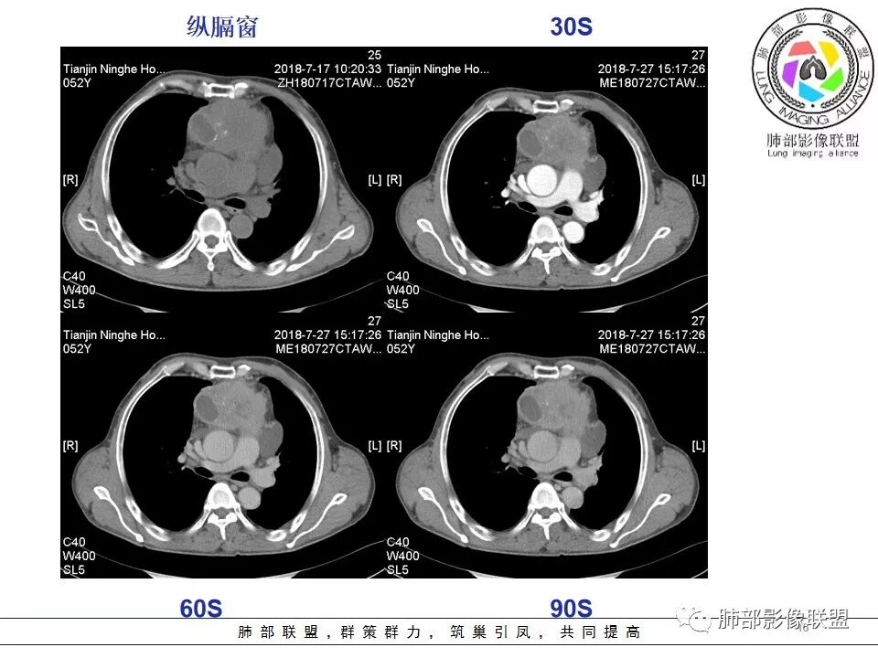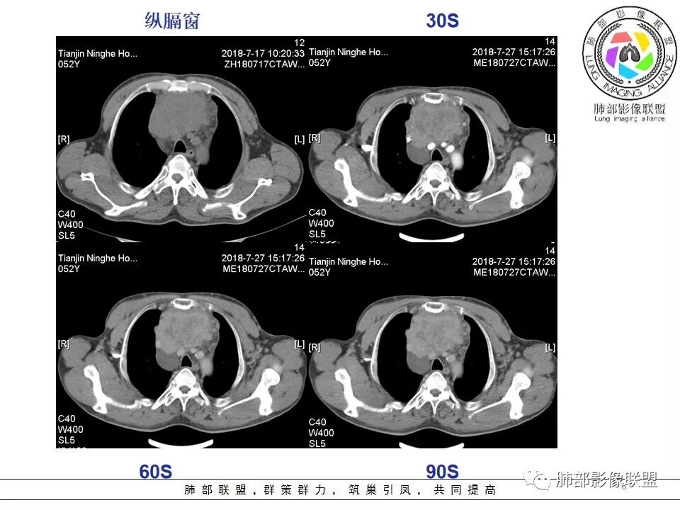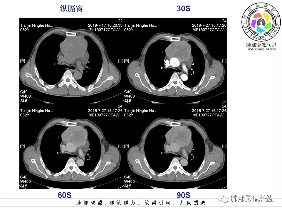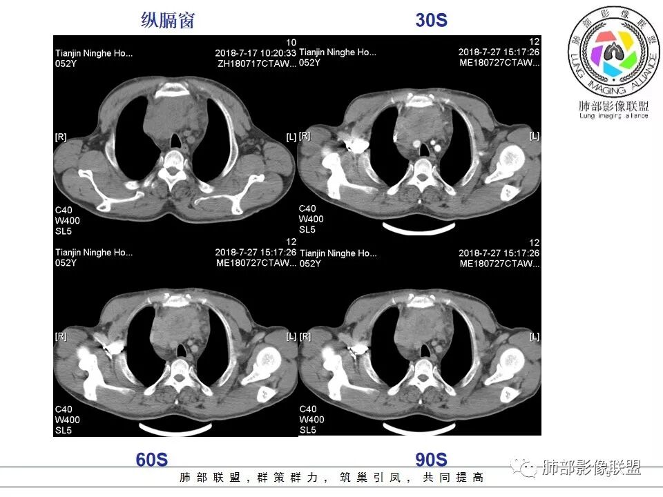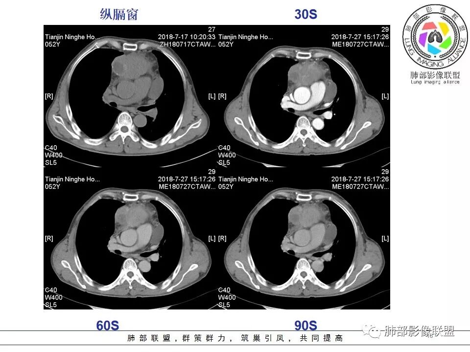 采莲:中年男性,前纵隔巨大肿块,基本居于中央,上腔静脉受压变窄,内有大片坏死,肿块内及周围有更低密度囊性影,考虑恶性胸腺瘤?鉴别淋巴瘤。