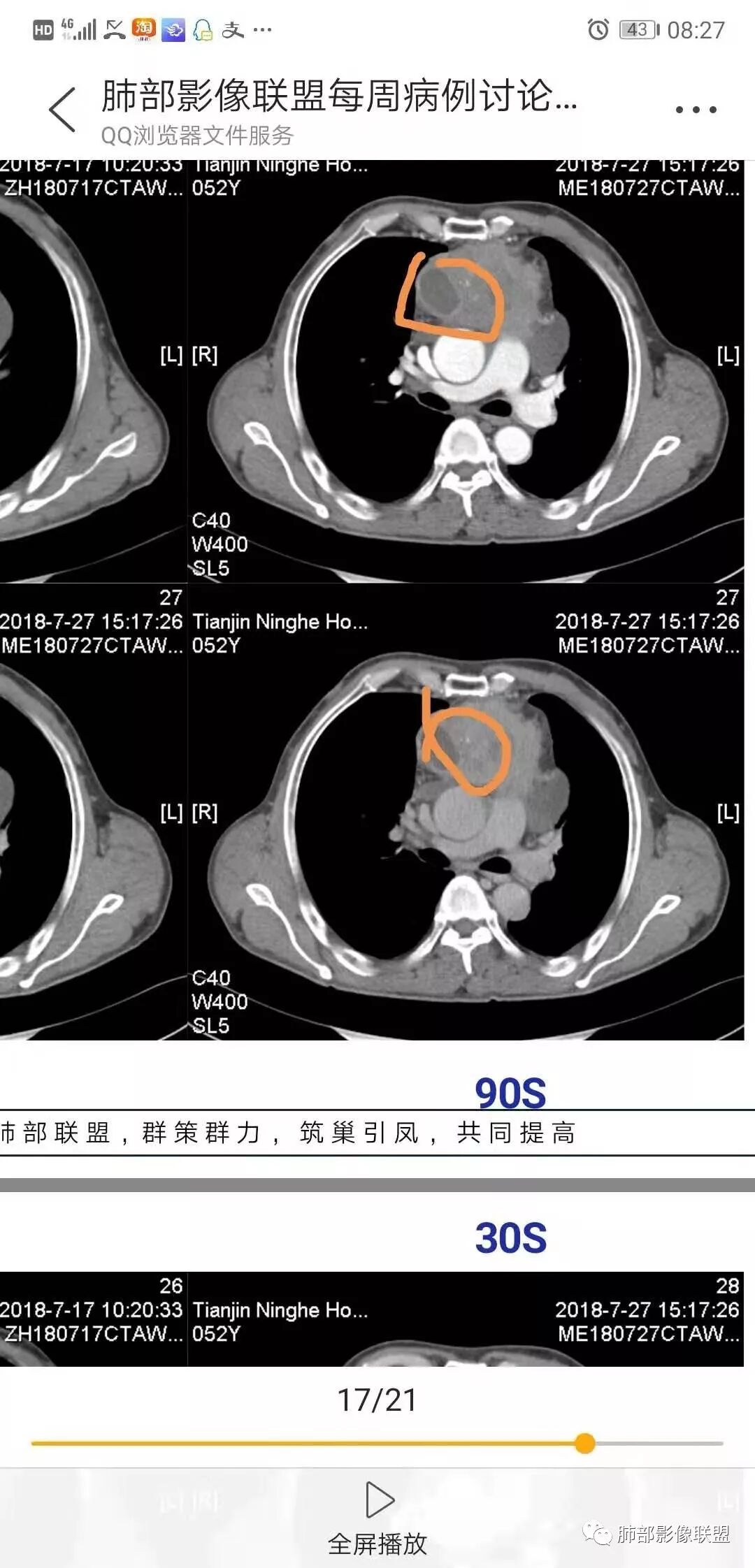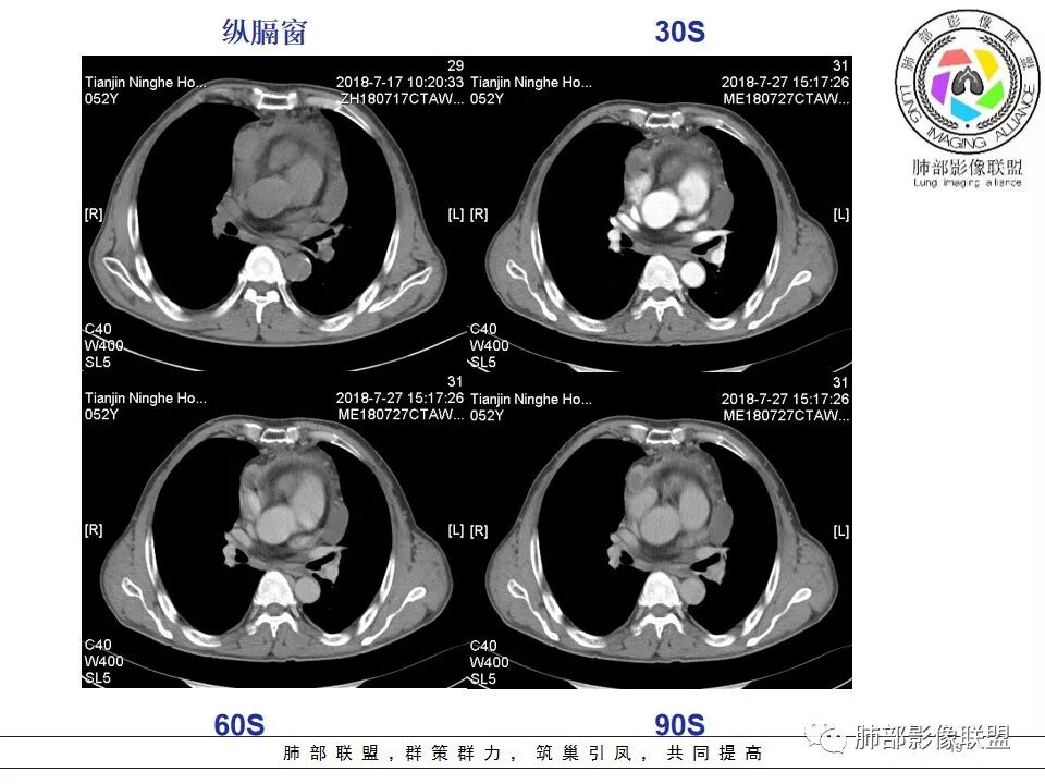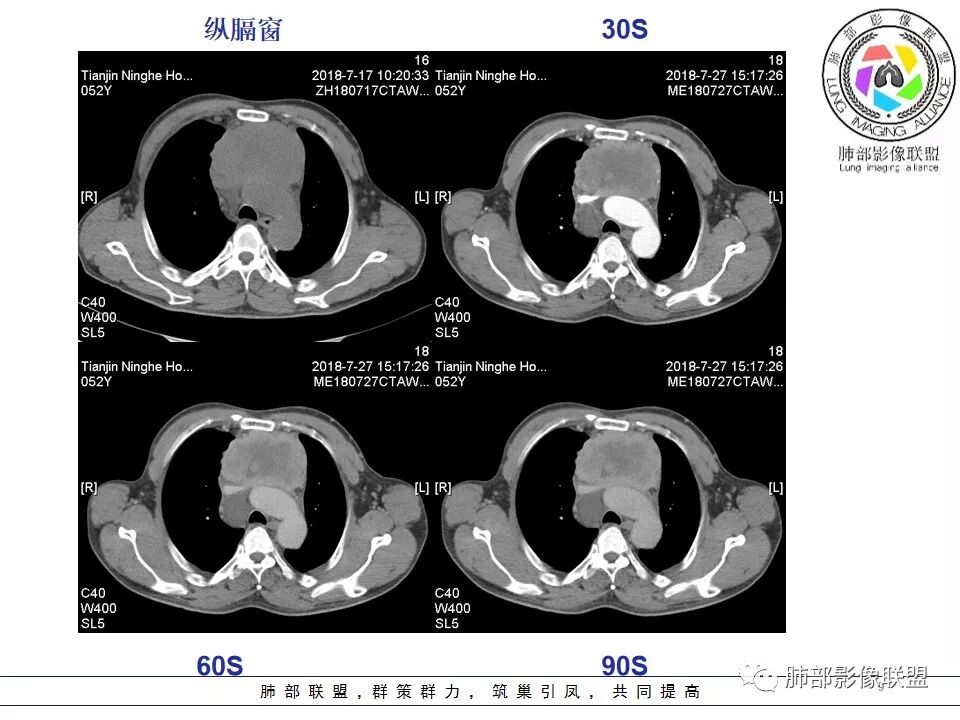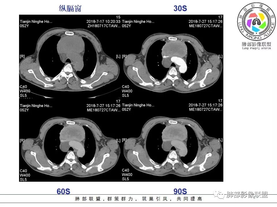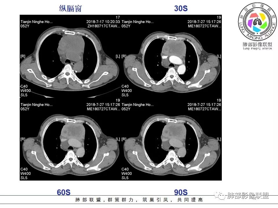 采莲:中年男性,前纵隔巨大肿块,基本居于中央,上腔静脉受压变窄,内有大片坏死,肿块内及周围有更低密度囊性影,考虑恶性胸腺瘤?鉴别淋巴瘤。