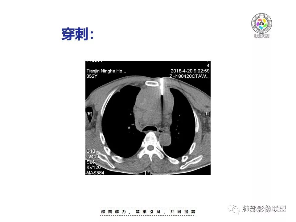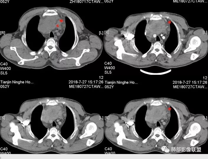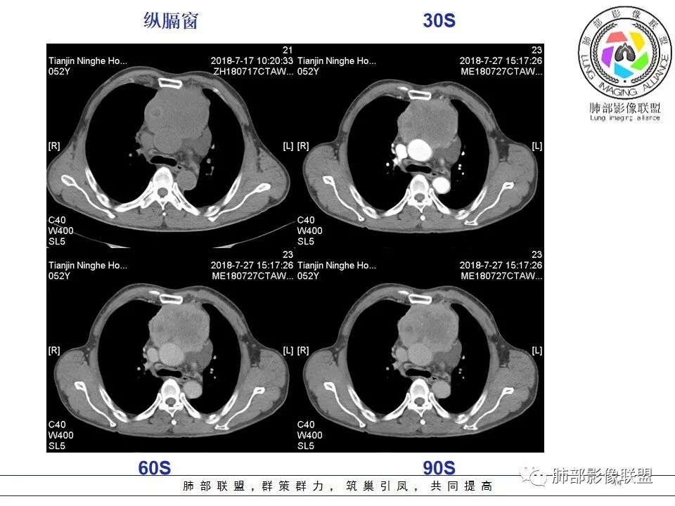 崔少钢:中年男性,左侧颈内静脉、左侧前胸壁及左上臂静脉曲张,提示有静脉阻塞,另患者有恶性家族史。影像:前纵隔占位,有浅分叶,周围脂肪间隙不清晰,且见小淋巴结,内有坏死,上腔静脉受侵,内有钙化,支持胸腺癌。