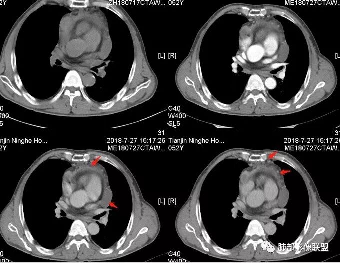 小强:前纵隔占位,其内密度不均匀,强化不均匀,心包增厚,心包积液,考虑恶性,胸腺癌?
