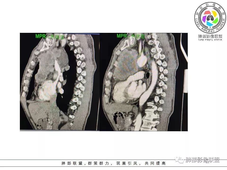 傅昌瑜:前纵隔巨大占位,形态不规则,边界较清晰 内可见坏死及少许钙化,增强后边缘强化明显,内部见低密度,心包受累,中纵隔未见病灶,考虑胸腺恶性肿瘤。