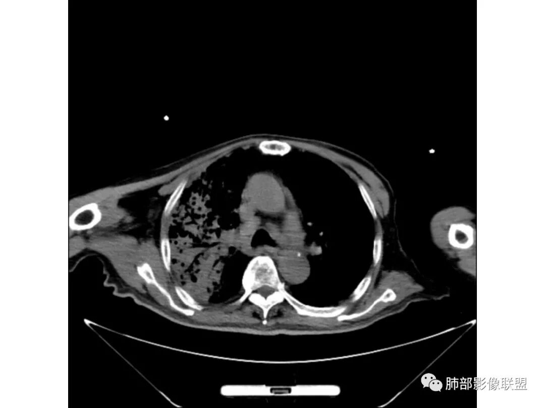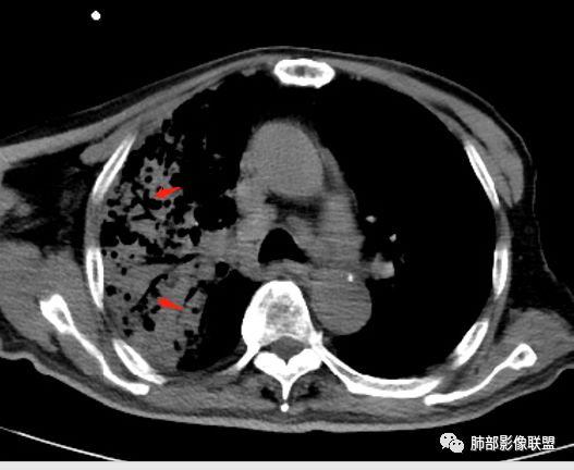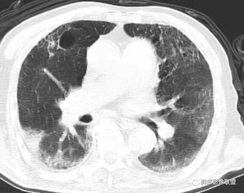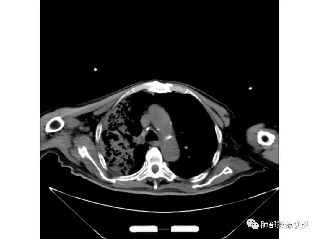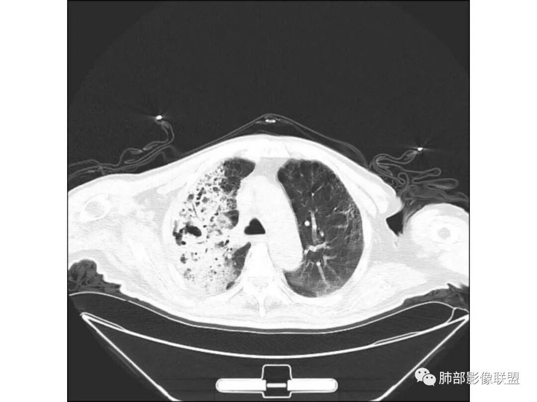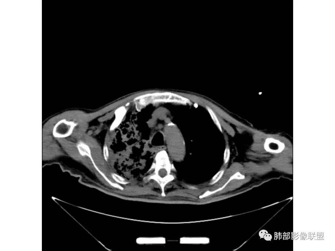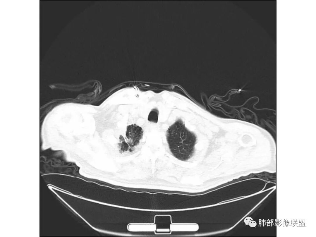 这个我个人觉得不一定是空洞,不排除原有基础病变就有柱状支扩与囊状支扩或囊腔样改变。因为本身这个病人就有肺气肿与双肺间质改变。