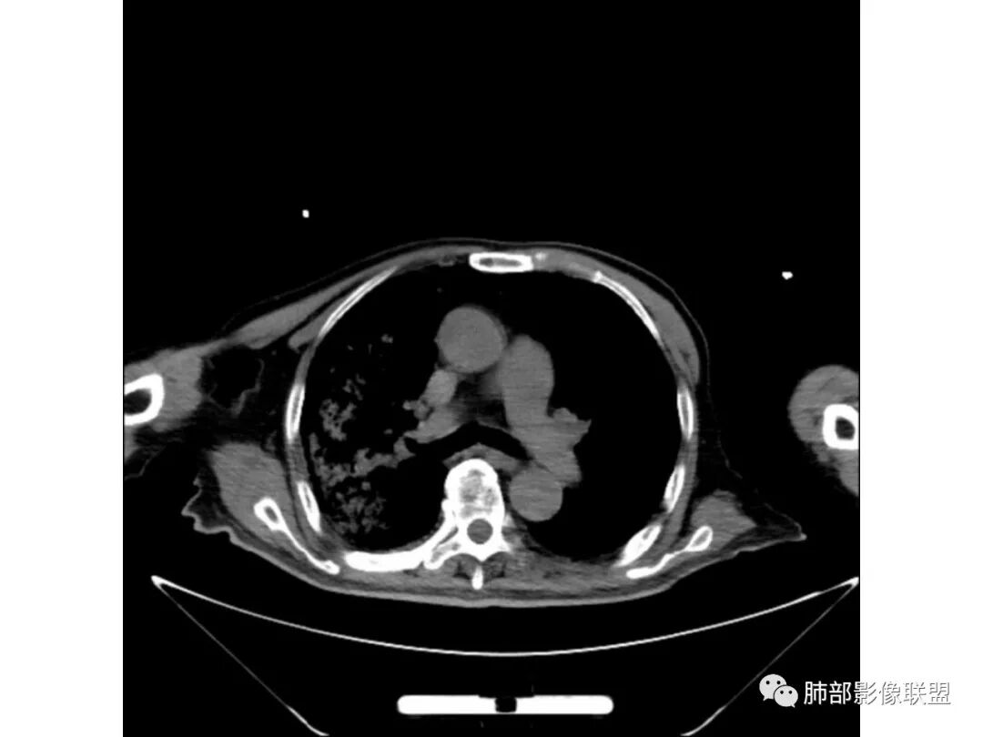 老年男性,既往糖尿病10年,右上肺不均匀实变+两肺实质及间质病变;本例良性感染性病变支持点:糖尿病史+双肺多发的实变,右上肺实变内可见支气管气像;恶性支持点:实变内的支气管似乎呈“枯树枝”样改变,纵隔有超过1.5cm的肿大淋巴结。