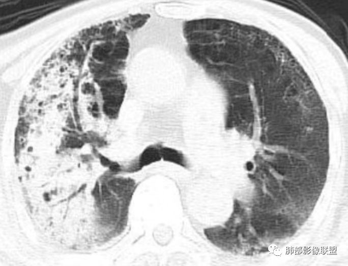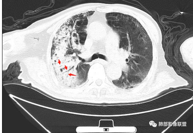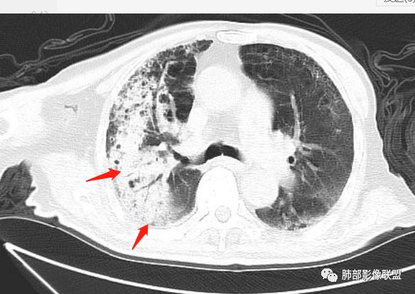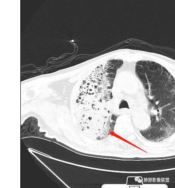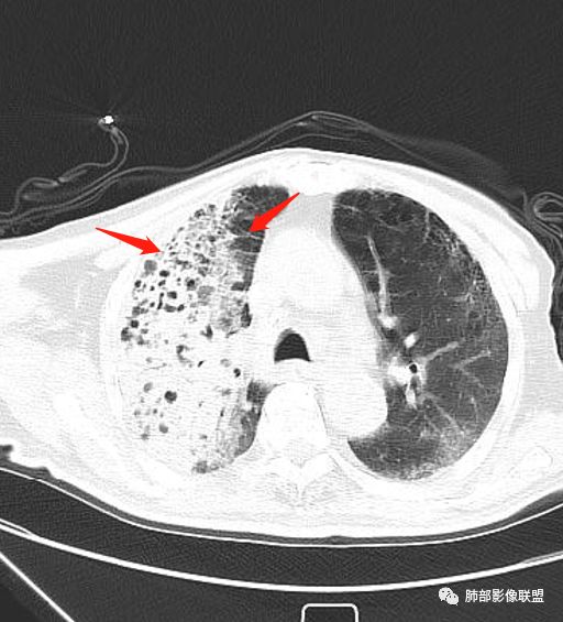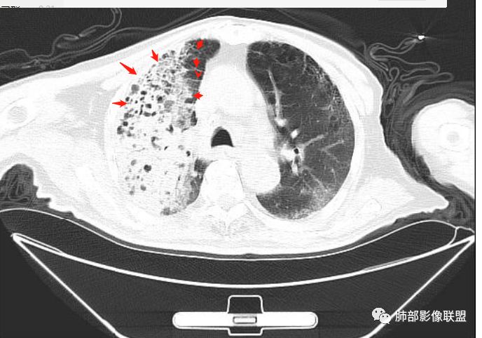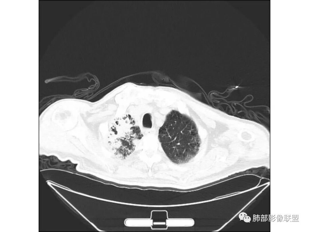 右上肺大片状高密度影,呈蜂窝样改变,部分气腔无壁,部分呈厚壁改变,内部结构紊乱,部分边缘GGO边界清楚,大小不一,病灶近端小远端大,近端支气管壁增厚,支持感染性病变,考虑结核,其内支气管呈枯树枝改变,病灶局部膨隆,内部结构紊乱,边界的GGO部分清楚,恶性(腺癌)待排。