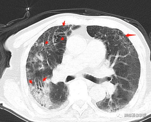 老年男性,右肺上叶大片实变,边界局部清楚,局部模糊,其内见支气管充气征及多发大小不等的小泡状及分枝状无壁空洞。双肺下叶磨玻璃样间质性改变。综合考虑右肺上叶结核,干酪性肺炎可能。