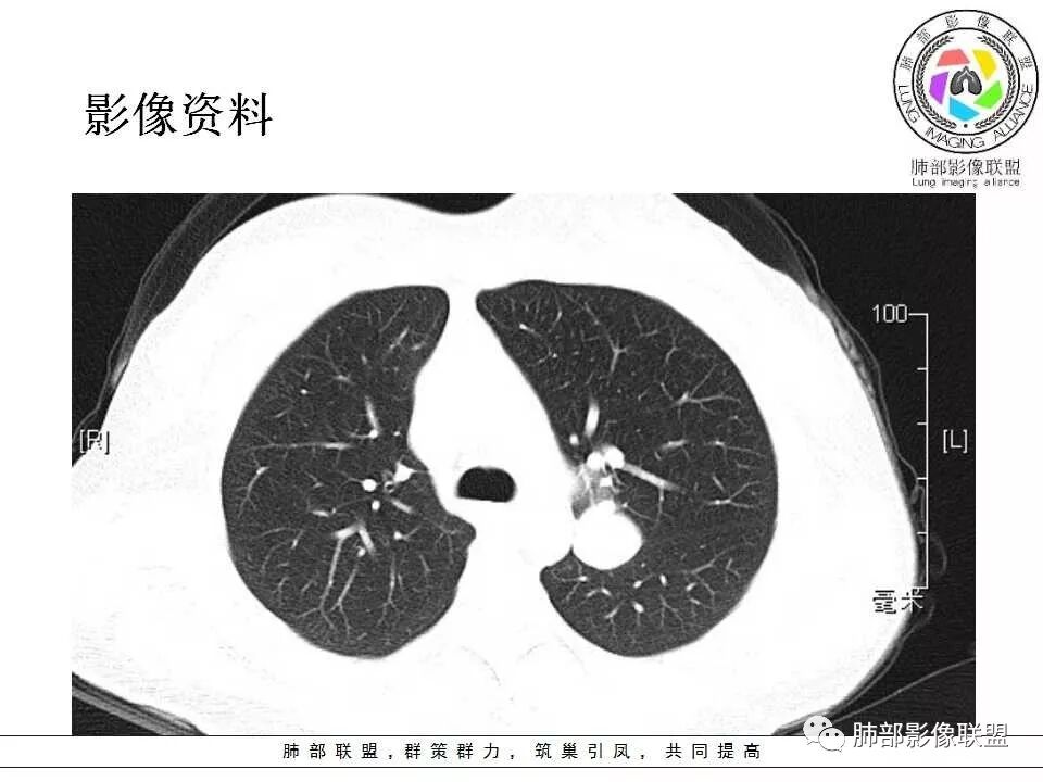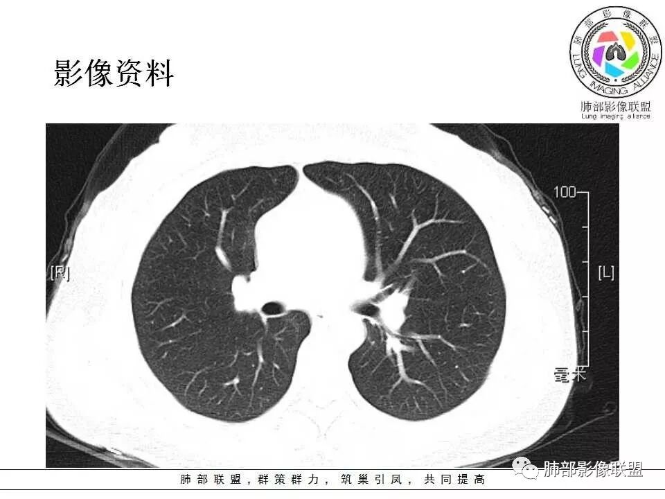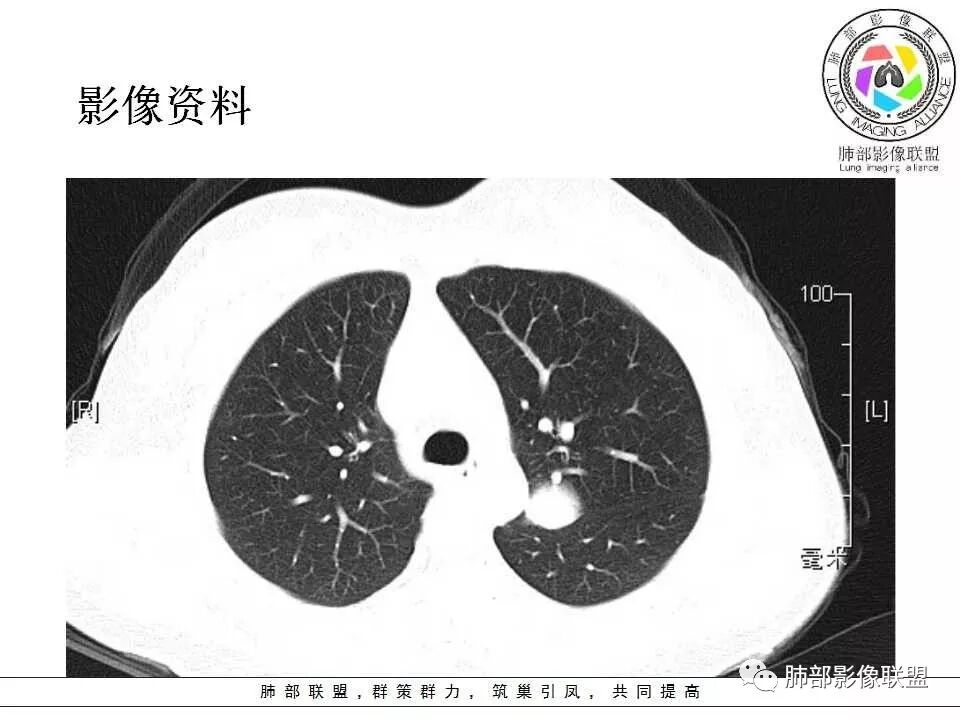 青年女性,慢性病程,实验室指标末提及,左肺门区肿块,边缘光滑,无明显分叶,周围清晰,增强明显强化,血管贴边,复查有增大,考虑良性或低度恶性病变,PSP?