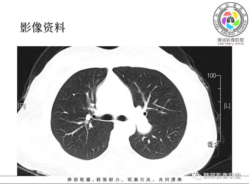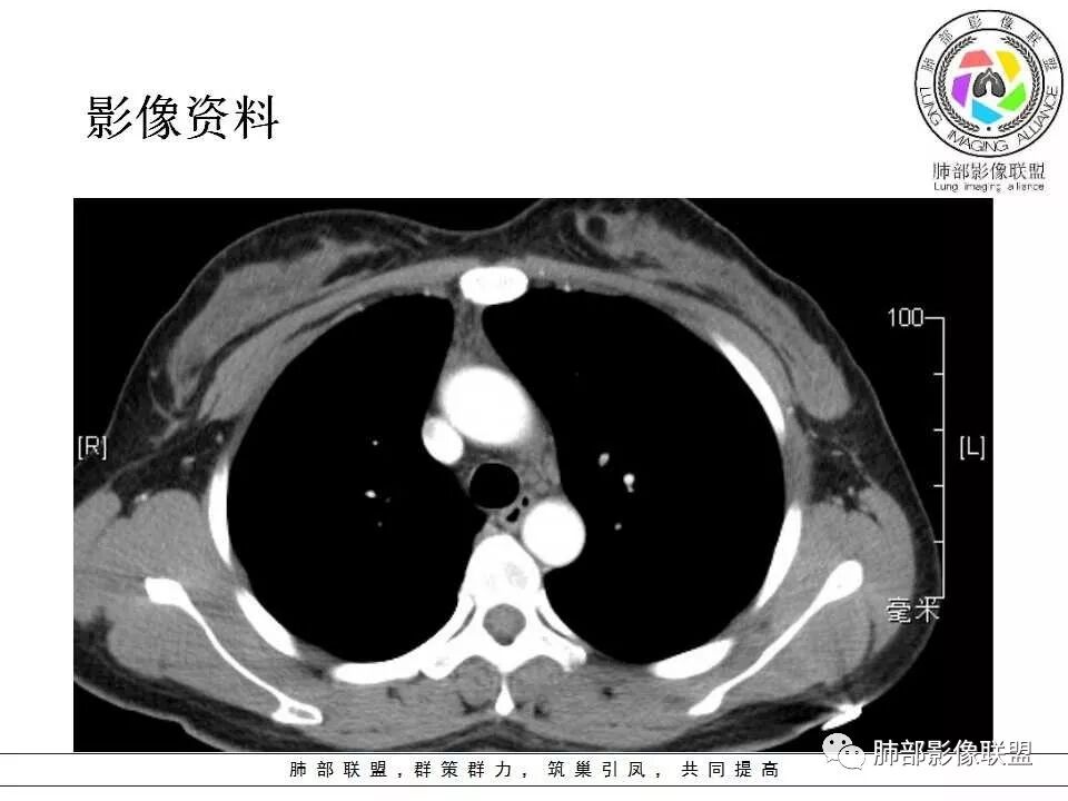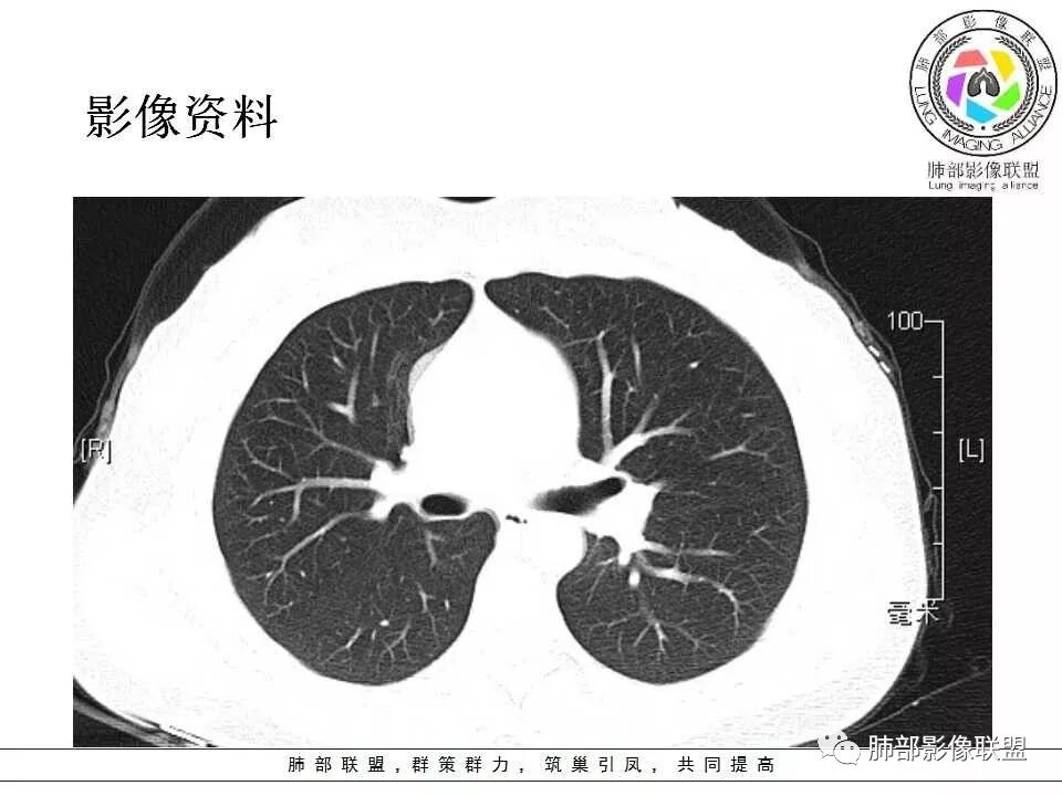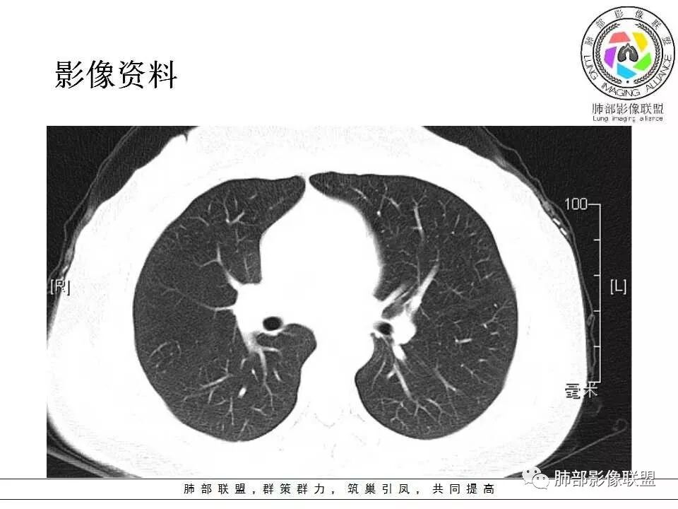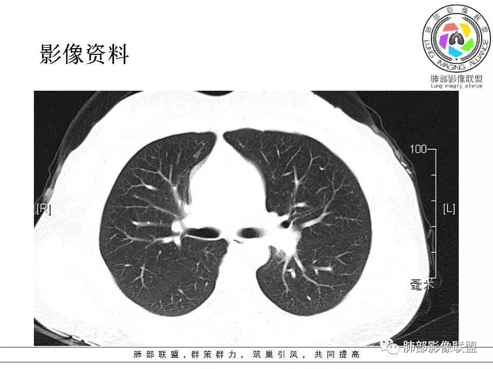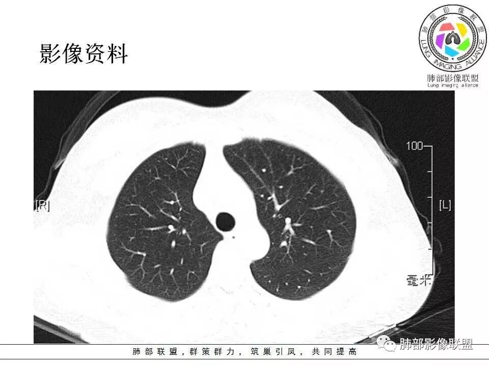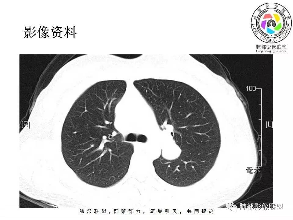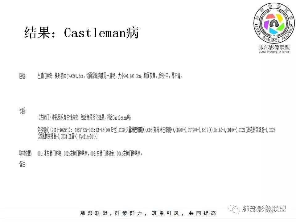 多发型CD少见,是一种全身性的淋巴结疾病,涉及多个系统,表现一组或多组淋巴结肿大,境界清楚,互相之间不融合,临床上常伴有发热、乏力、肝脾肿大、贫血、肾功能不全等症状,因为其病理类型多为浆细胞性或混合型,血供不如透明血管型丰富,强化没有单发型CD明显,所以CT表现缺乏特异性;因为CD本质就是淋巴增值性疾病,所以后期会发展为卡波西肉瘤或淋巴瘤,而且累及肺部时病理学多以淋巴细胞性间质性肺炎(LIP)多见,肺上LIP主要表现为边缘模糊的小叶中心结节、薄壁囊腔、血管支气管束增粗和小叶间隔增厚,少数可出现胸膜下结节、磨玻璃密度影、气腔实变和支气管扩张;多发型CD影像表现为多发淋巴结肿大伴肺内LIP时有时需要与结缔组织疾病、淋巴增生疾病(淋巴瘤)、浆细胞疾病等鉴别。