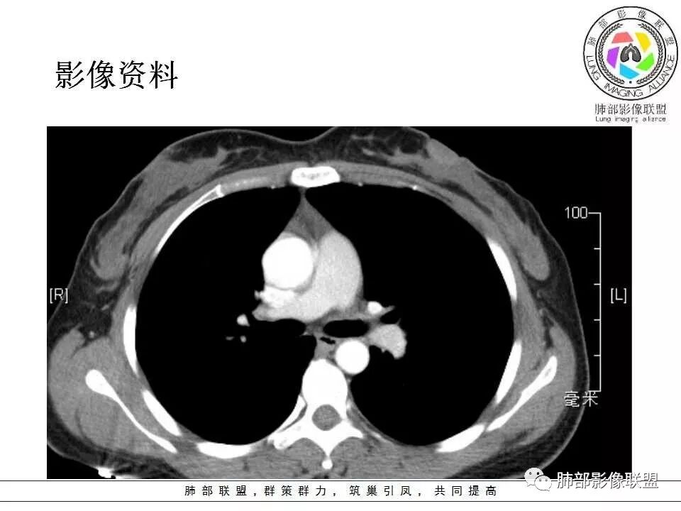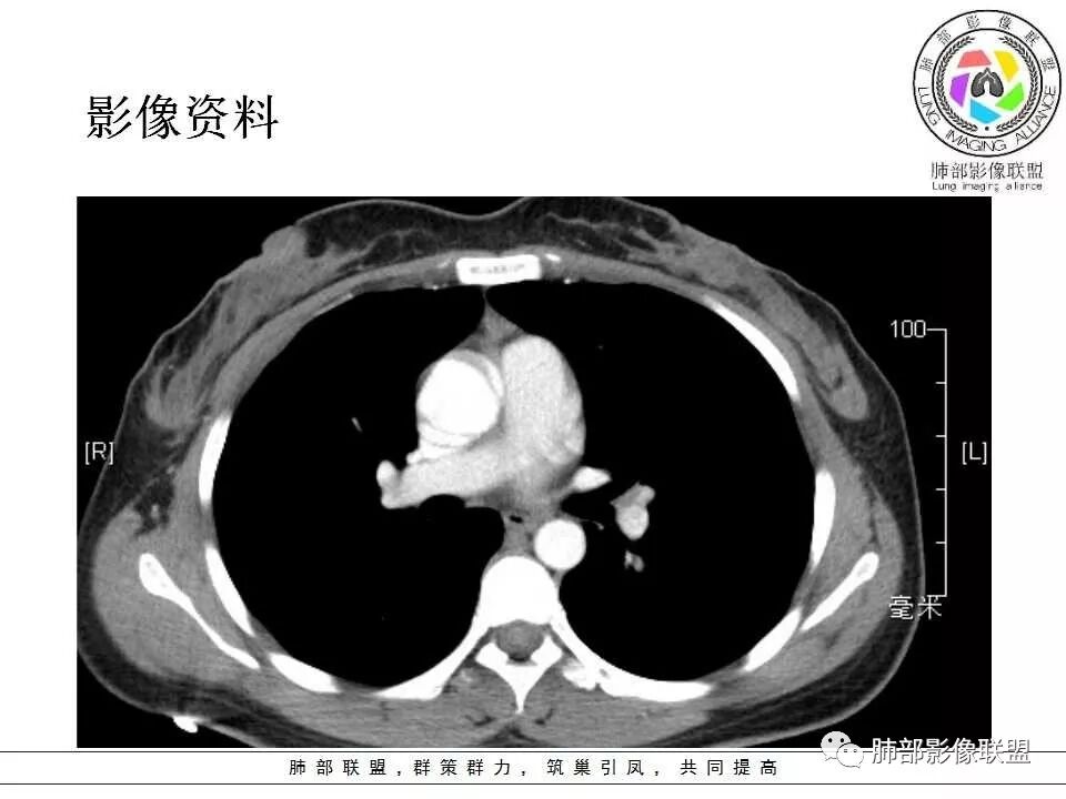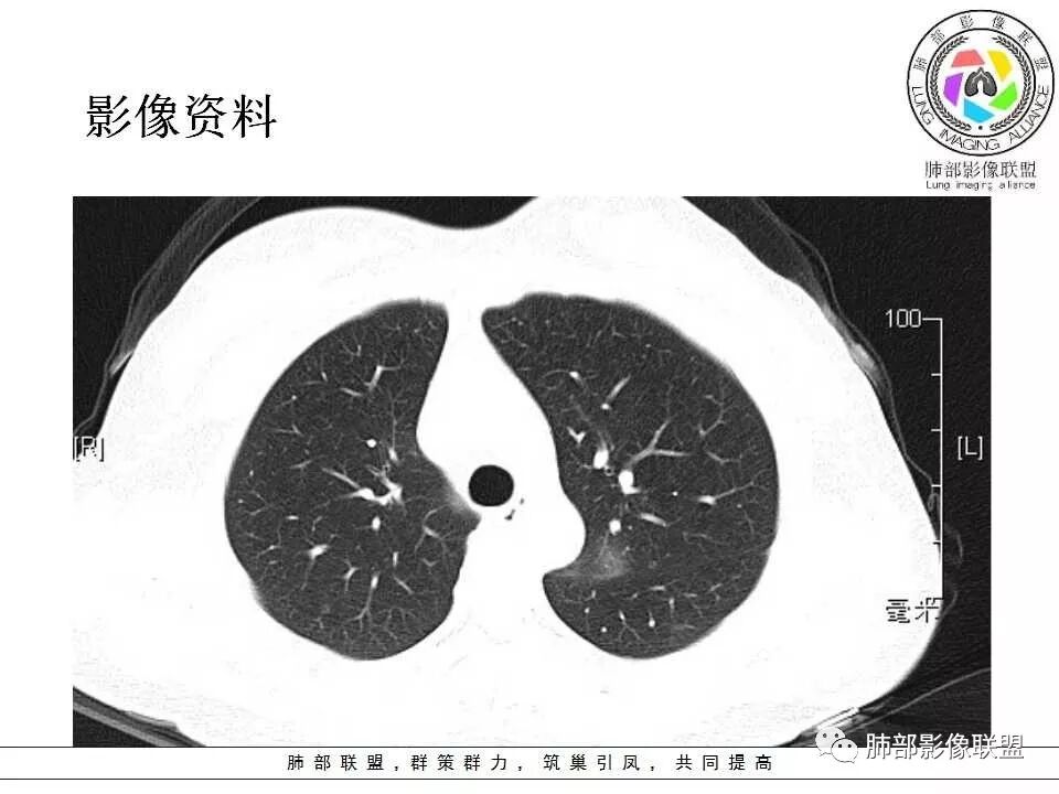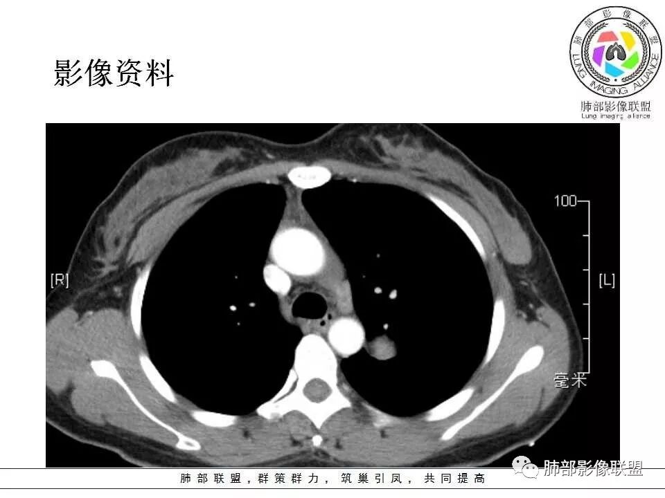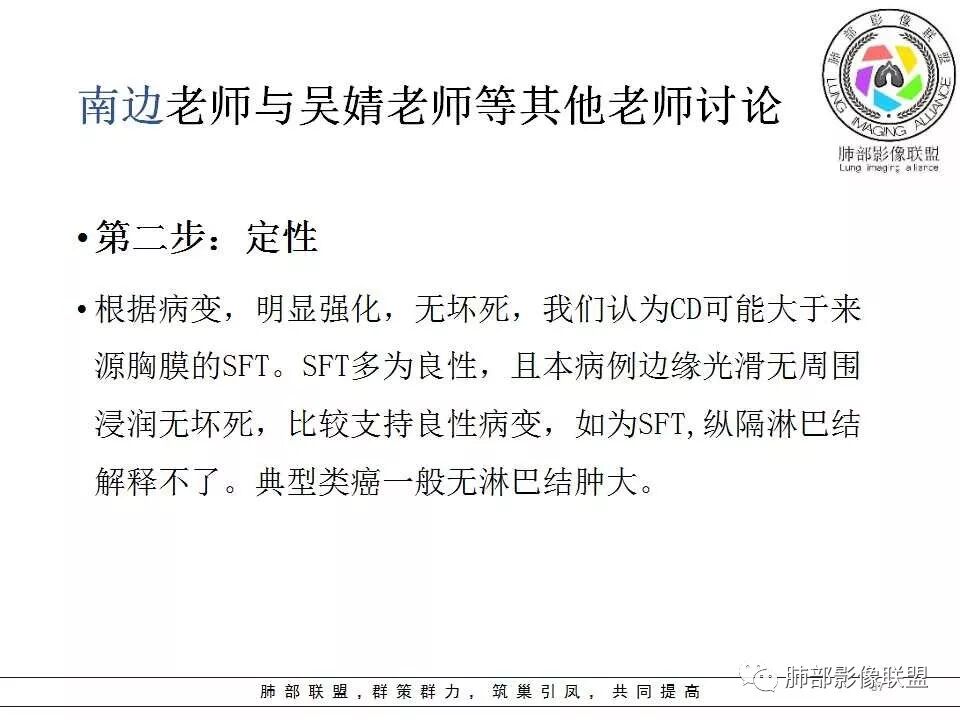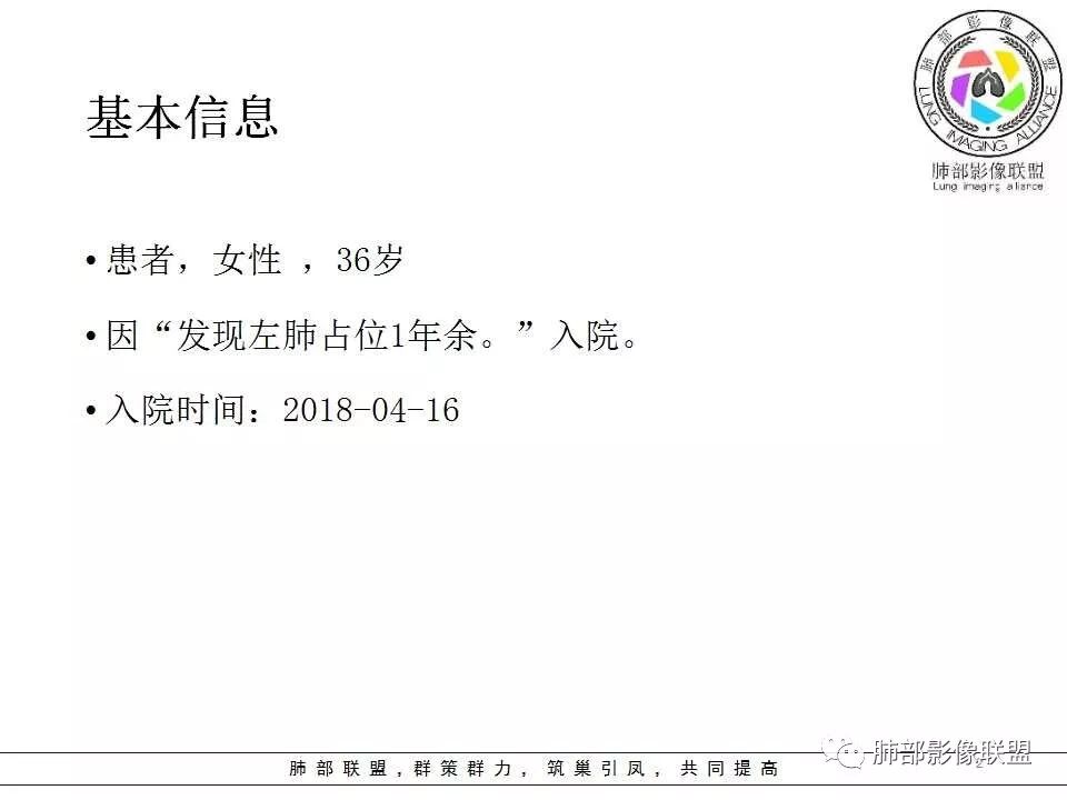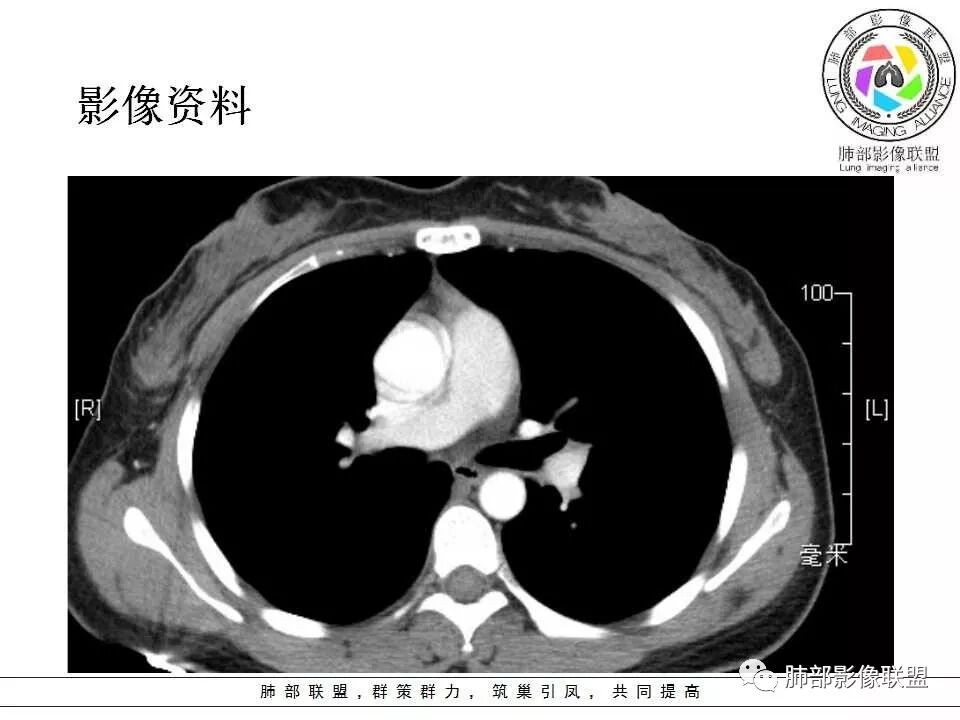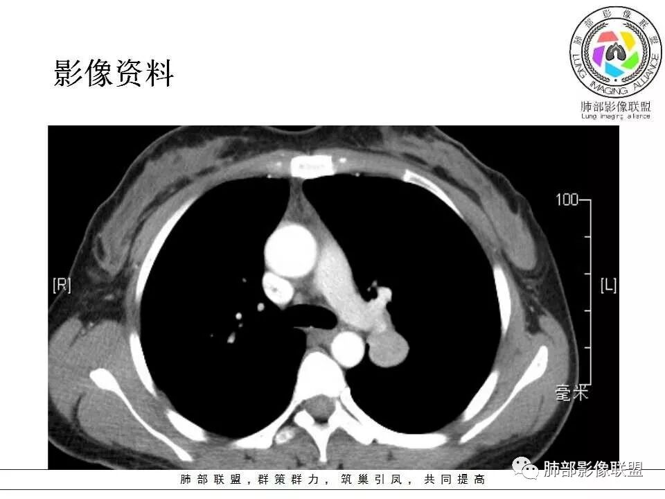 年轻女性,边缘光滑圆形肿块,均匀强化,血管贴边儿,常规考虑硬化性肺细胞瘤(PSP)。不放心的地方就是幻灯第22幅,似乎有一个小尾巴。巨淋巴结增生症(CD)及类癌待排。CD这个部位可以,但是相对少见的多。类癌的话强化可以,但是形态太规整了,似乎也不符合。潘老师还说过一个糖瘤,忘记长啥样儿了。