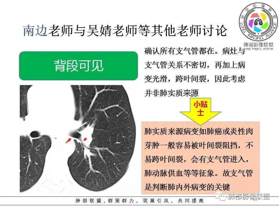 左肺上叶后段紧贴斜裂结节影,支气管通畅,斜裂无移位,说明病灶来源斜裂可能,强化密度均匀,边缘清晰,考虑良性病变,PSP可能性大,鉴别CD。