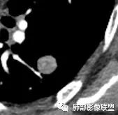 边界清,类圆形,不均匀强化,贴边血管征,PSP可能,鉴别肉芽肿性病变,错构瘤,腺癌。
