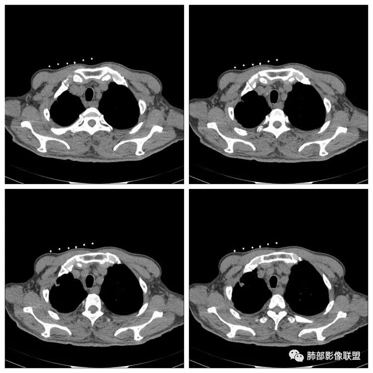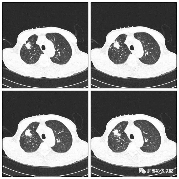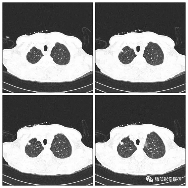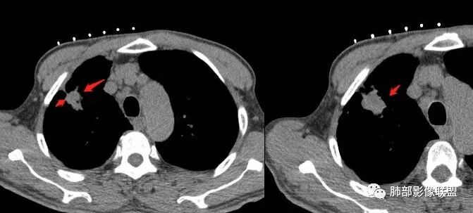 红日东升:老年男性,贲门癌病史。右肺尖段病灶,收缩明显,多发毛刺,胸膜牵拉,局部胸膜增厚牵拉,周围卫星灶,右上叶体积较小。考虑炎性肉芽肿,结核可能,鉴别腺癌。