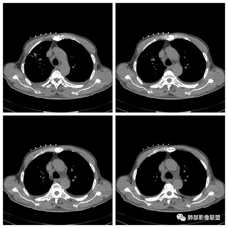 南边:纵隔淋巴结有融合的迹象,边界不清,右侧内乳动脉增粗了很多;怀疑纵隔淋巴结用血很大。有结核的话并不代表不能得癌肿;一般情况下结核附近的病灶呈条索树芽状;综上所述恶性不能完全排除。
