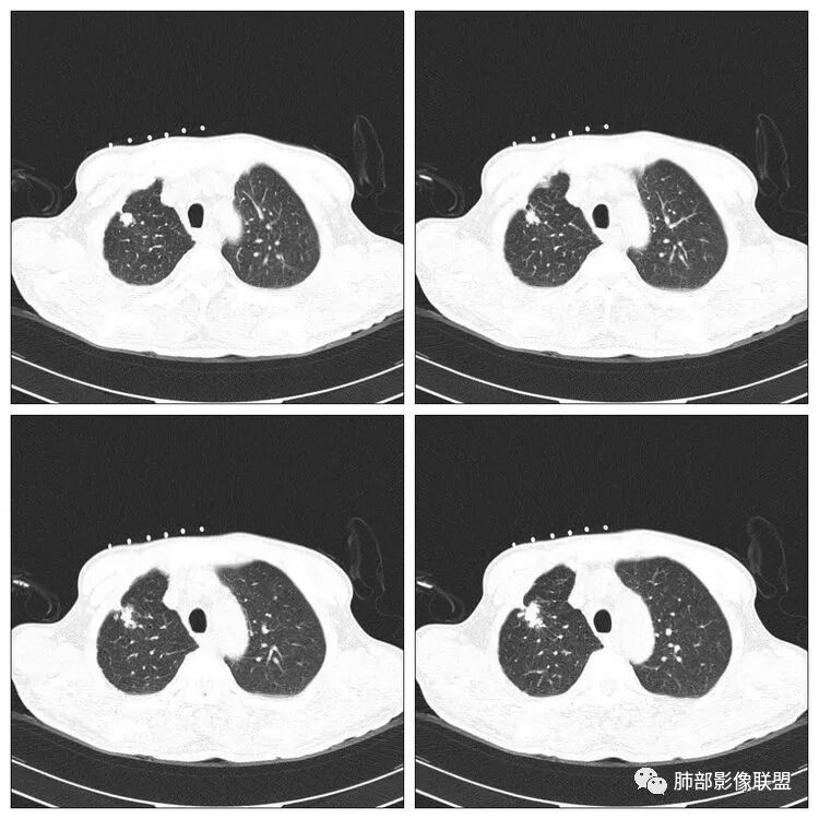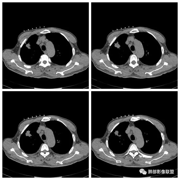 没意见:老年男性,贲门癌病史;CT:右肺上叶前段块状影,病灶由上至下纵轴跨度略长,轴位多个层面提示分叶、膨隆,毛刺,局部平直、内收、凹陷;病灶略散,主体病灶周边卫星灶,支气管树芽征,胸膜增厚,牵拉凹陷,4R淋巴结稍大;整体感觉良恶征象皆有,遗憾没有增强,无法进一步确认,目前转移瘤可能性小,考虑结核可能性较大,需要与原发肺癌鉴别;