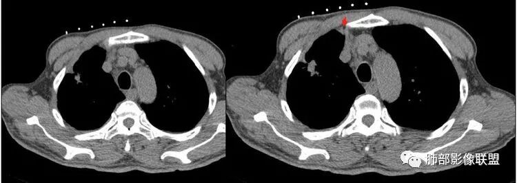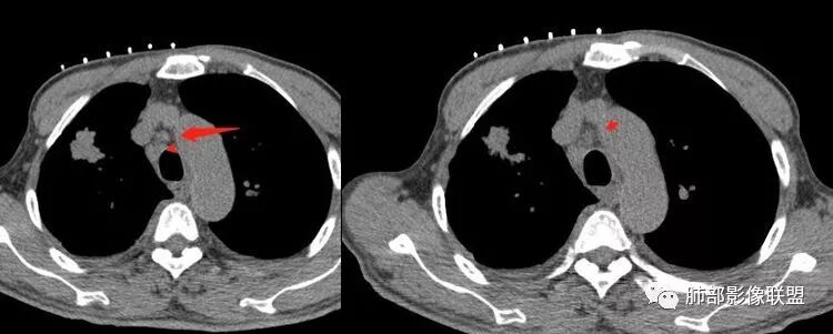 这种纵隔右移提示病程较长,腔静脉后见轻度增大淋巴结。