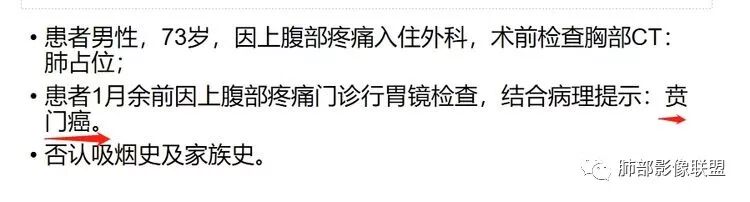 患者男性,73岁,因上腹部疼痛入住外科,术前检查胸部CT:肺占位;患者1月余前因上腹部疼痛门诊行胃镜检查,结合病理提示:贲门癌。否认吸烟史及家族史。