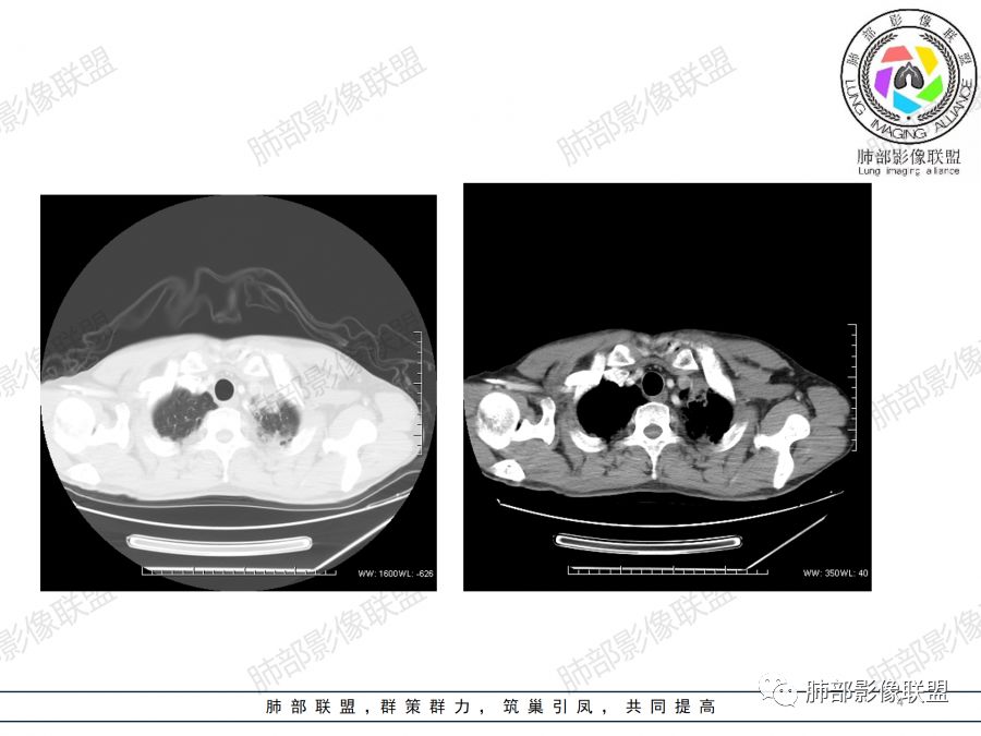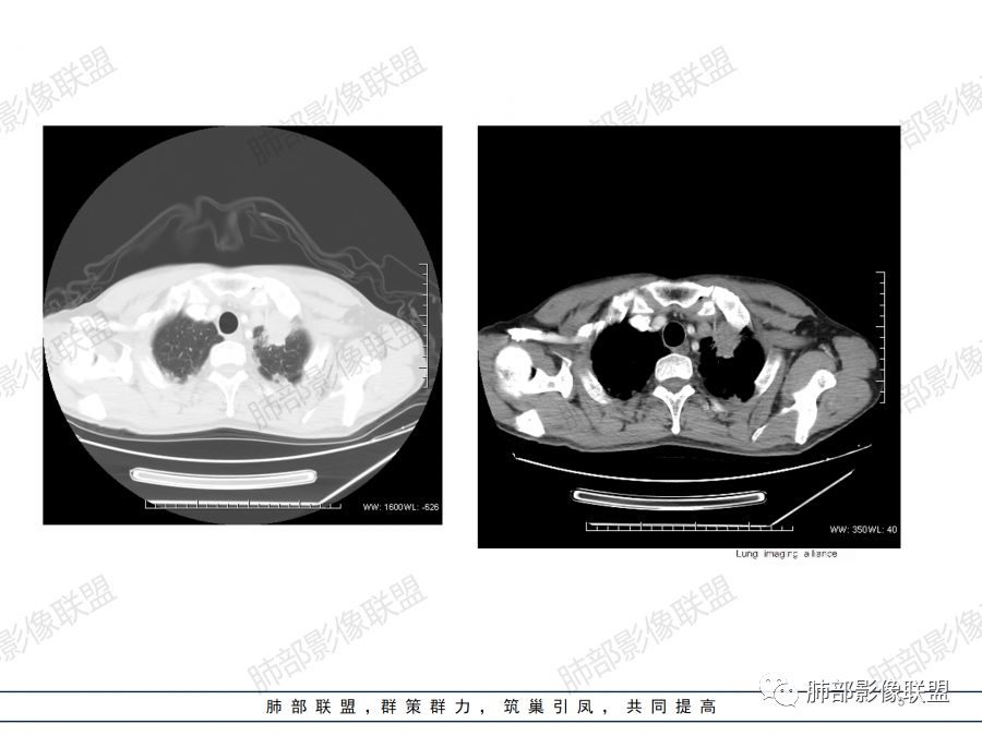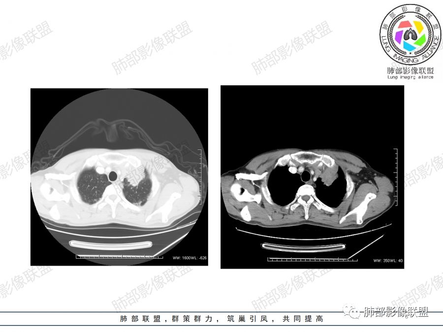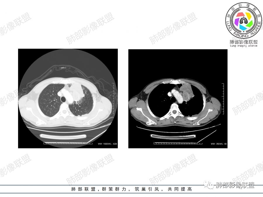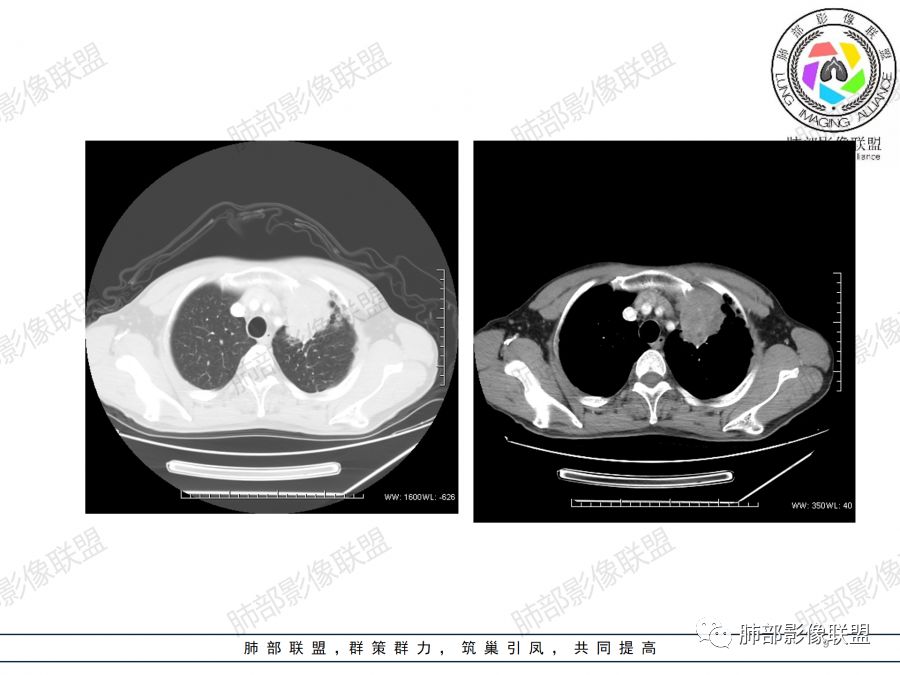 病灶与大气道的关系未能满意呈现,但如此大范围病灶紧贴胸膜却未见胸壁纵隔组织结构侵犯破坏是不大符合肺鳞癌的生物学行为的。