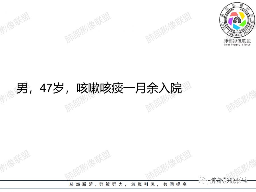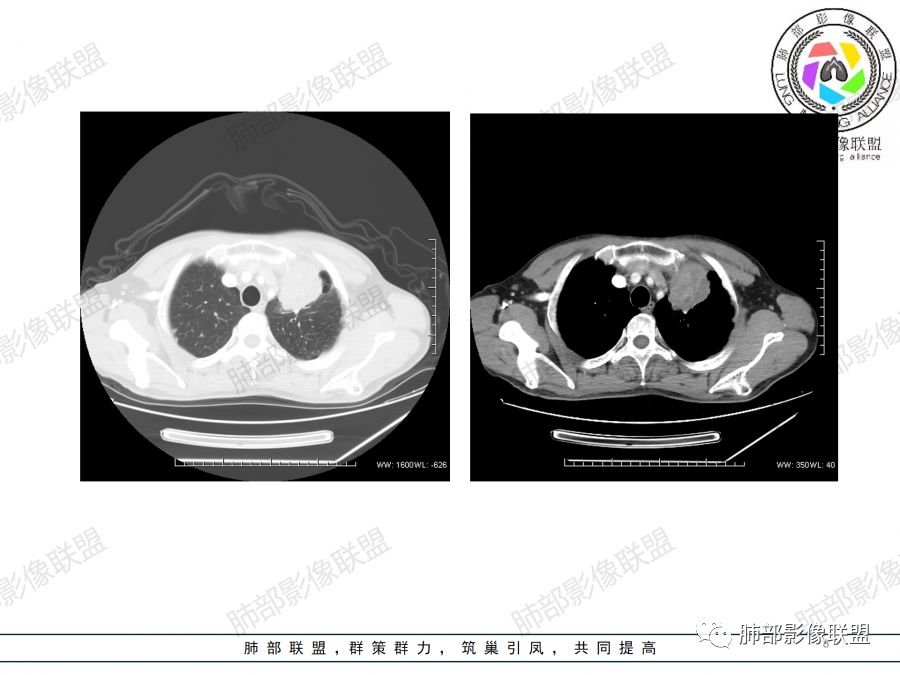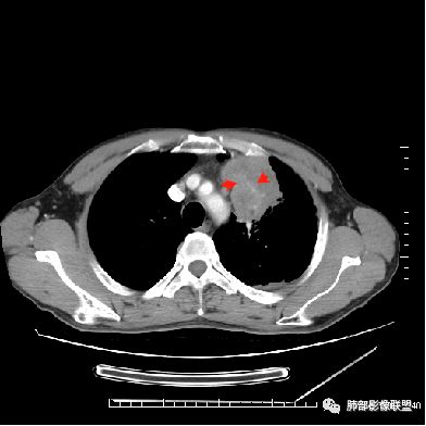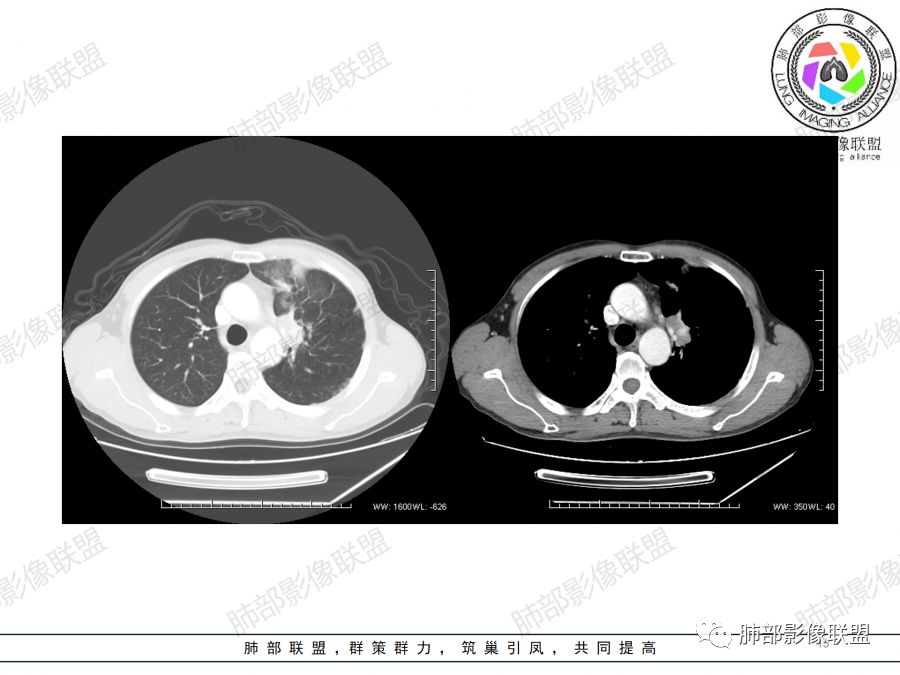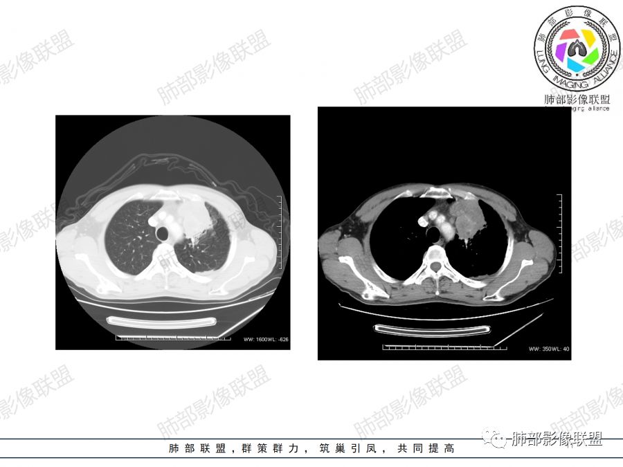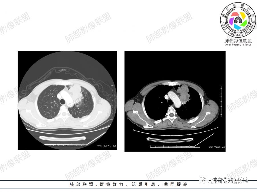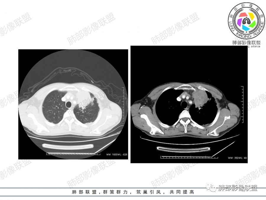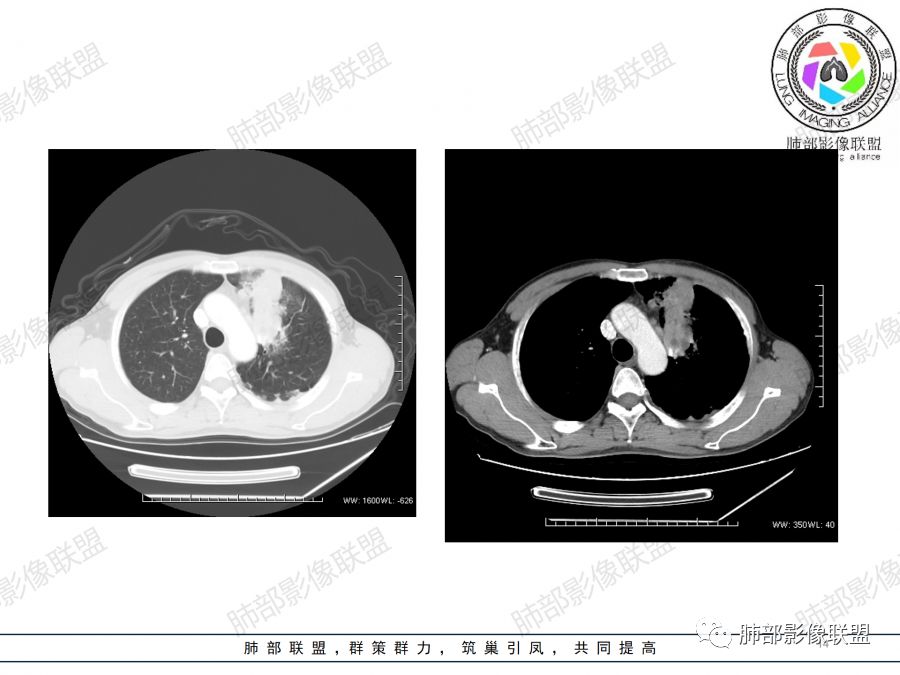 47岁男性,咳嗽咳痰1月余。左肺上叶结节灶,形态不规则,边缘见分叶,其内可见斑片状低密度区。增强扫描呈轻度强化,侵犯纵隔及部分胸膜,综合考虑恶性!