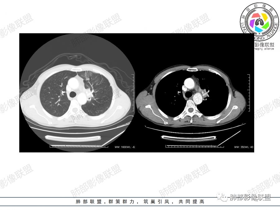 男,47岁,咳嗽咳痰一月。病灶位于左内乳动脉内缘,定位肺内,呈团片状异常密度影,整体沿支气管气管束走形分布,由肺门达胸膜下,于近肺门侧病灶形态相对较小,病灶远端相对较大,病灶整体密度偏均匀,强化偏明显,病灶内见多发支气管扩张并粘液栓形成,且扩张支气管粗细不均,直达病灶以远,病灶内血管走形正常、粗细均匀,病灶周围见边缘模糊磨玻璃及少许腺泡结节。左肺门及纵隔略大淋巴结,左侧胸膜局限性增厚。诊断:左肺上叶前段异常密度影,炎性肉芽肿性病变可能,结核不能除外,建议穿刺活检除外恶性肿瘤。