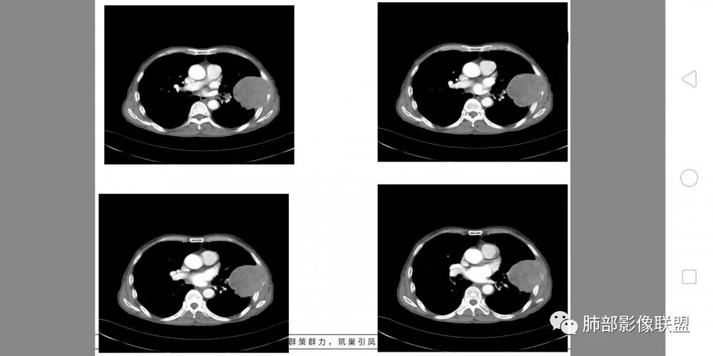 老年男性,外伤发现,左下肺近胸膜下巨大肿块,外朝内,与胸膜宽基底相连,有栽赃,有肋骨破坏,病灶有强化,不均匀强化,内有低密度区,与支气管关系不大,支气管受压推移,纵隔淋巴结不大,定位不好说,觉得肉瘤可能性大,鉴别大细胞肺癌?
