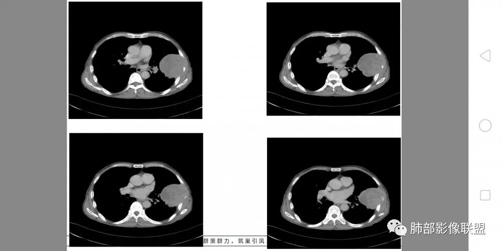 我们换个角度讲,如果是胸壁肋骨来源,病灶外朝内生长,并且朝内生长这么大,按理说应该是内侧侵袭性强,外侧侵袭弱。但是看这个病灶,外侧边界反而不清,内侧边界清,整个形态不太符合肋骨来源,而且胸膜局部增厚也不太符合胸壁来源。我认为肋骨来源应该以肋骨为中心,偏侧可以,但不会这么明显。而且血供也不一致,应该是肋间或胸壁动脉明显。