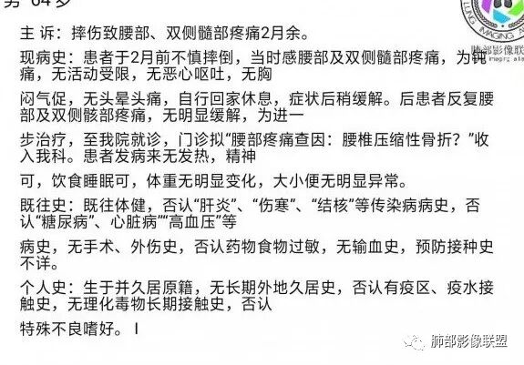 • 患者老年男性,因摔伤致腰部、双侧髓部疼痛2月余就诊