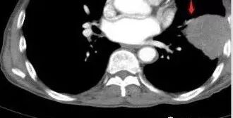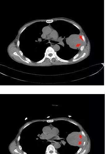 左肺上叶肿块,边缘光滑,向外侵犯胸膜,临近肋骨及胸壁,增强不均匀强化,有坏死,考虑为肺内恶性肿瘤侵犯临近肋骨及胸壁。鉴别孤立性肋骨浆细胞瘤,向肺内突出形成猫在毯下征,胸壁侧累及少
