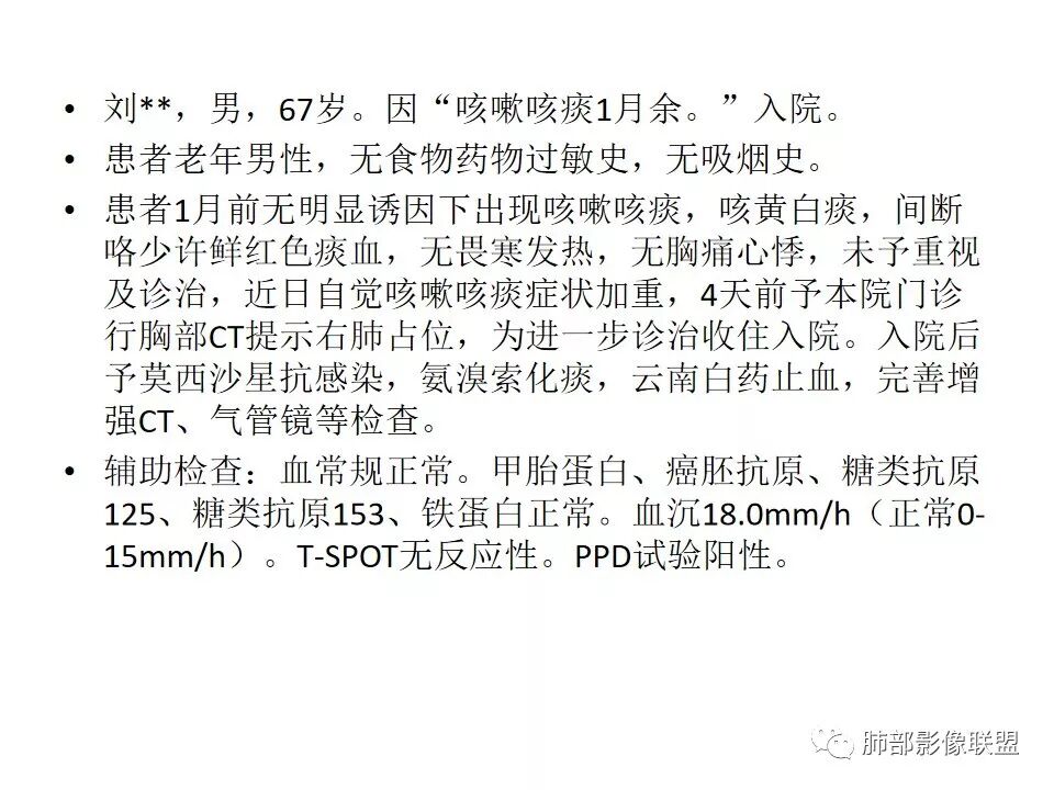 老年男性,咳嗽、咳痰1月余,间断血痰。PPD阳性。
